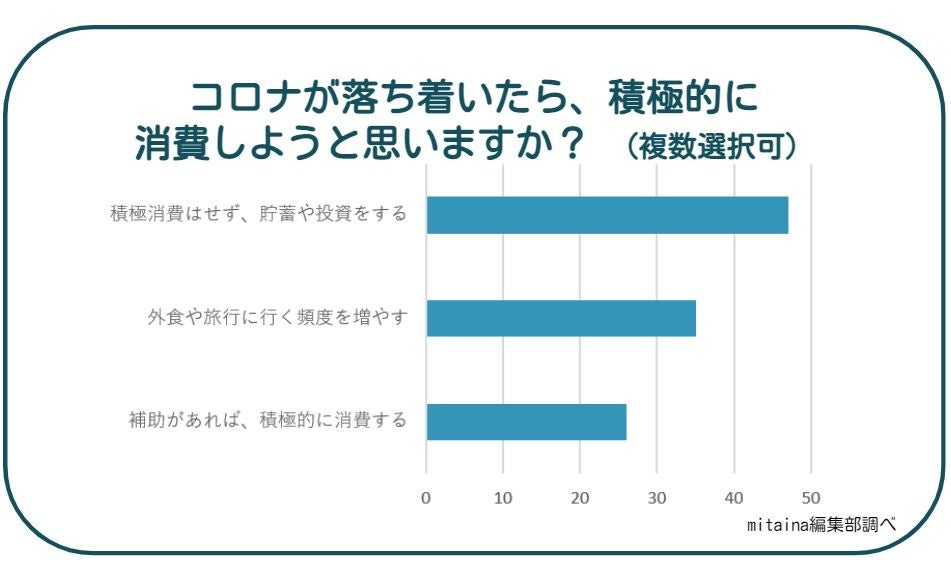 47名というほぼ半数の人が「積極消費はせず、貯蓄や投資をする」と回答しました。