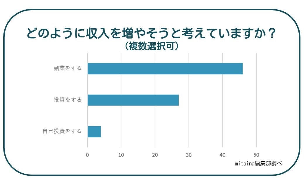 収入を増やす手段について、46名が「副業」、27名が「投資」、4名が「自己投資」と回答しました。