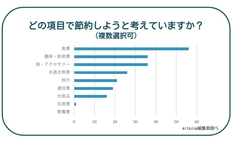 次いで、「水道光熱費」26名、「旅行」21名、「通信費」19名、「化粧品」16名という結果に。「住居費」と回答した方は1名のみ、節約項目として「教養費」を選んだ方はいませんでした。