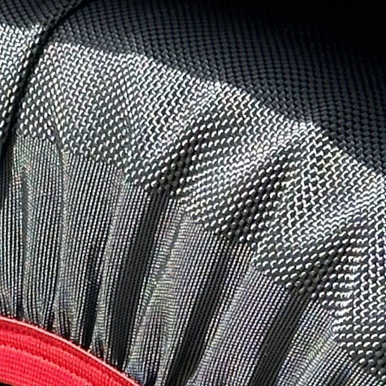 表面を拡大すると、独特な構造が明らかになります。トレッドを覆う部分と、ゴムに近い部分では異なる織り方が施され、特にゴムに近い部分は精密な織りで仕上げられています。この革新的な手法は、2枚の布を組み合わせるのではなく、単一の布の中に異なる織りを実現するというイッセ社の技術革新によるものです(特許出願中)。細かい織りを取り入れることでトレッド部分にかかる"ギャザー"が少なくなることが確認されており、ギャザーの擦れにより生じていた布のダメージが軽減されました。