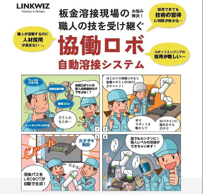 リンクウィズ株式会社(本社:静岡県浜松市、代表取締役:吹野 豪)は、「2022国際ウエルディングショー」に出展いたします。本展示会では、従来からの主力製品であるインライン向け3D検査ロボットシステム「L-QUALIFY」とティーチングデータ自動生成・補正機能付きロボットコントロールシステム「L-ROBOT」の展示をメインとし、板金溶接現場向けソリューションとしてL-ROBOTと協働ロボットを組み合わせた自動溶接ソリューションを初展示します。