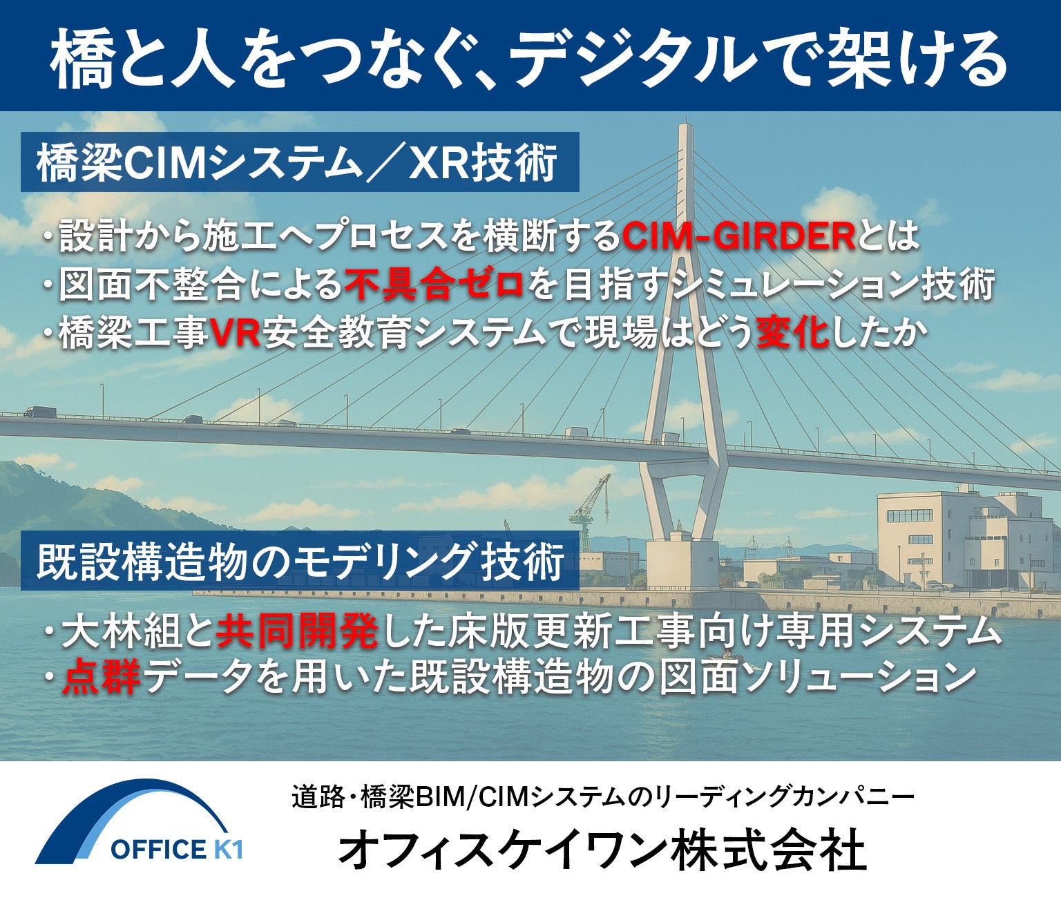 橋梁CIMシステム、施工シミュレーション技術、生産性向上の取り組み、橋梁工事VR安全教育システム、床版取替工事向けCIMシステムを展示します!
