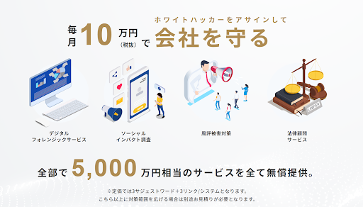セキュアナイトとはLibrus株式会社が提供する、企業の事業継続のための専門的なアソシエーションを通じて、企業がサイバー攻撃を受けた際に総合的な解決策を月額10万円~(税抜)でご提供するサービスです。デジタルフォレンジック、ソーシャルインパクト調査、⾵評被害対策、法律顧問サービスまで、5,000万円相当のサービスを全て提供可能です。