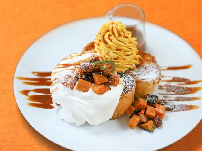 自家製アパレイユに浸してふっくらと焼き上げたフレンチトーストに、ふんわりかぼちゃクリームや、フライドかぼちゃ、香ばしいキャラメルソースを合わせることで、パンプキンプディングのような味わいをお楽しみいただけます。