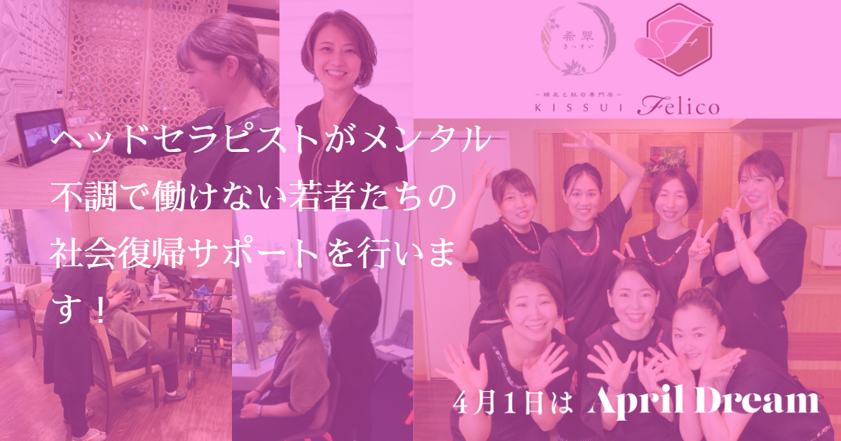 今後は、これまでの経験や知識をもとに、精神障害者グループホームなどと連携し、メンタル不調で働けない若者にも、ストレス疲労計測器を用いた自律神経の測定、ヘッドスパによるリラックス効果で睡眠の質を高める取り組み、正しい食生活のアドバイスなどのサポート支援を行い、社会復帰を促す活動にも力を入れてまいります。「April Dream」は、4月1日に企業がやがて叶えたい夢を発信する、PR TIMESによるプロジェクトです。