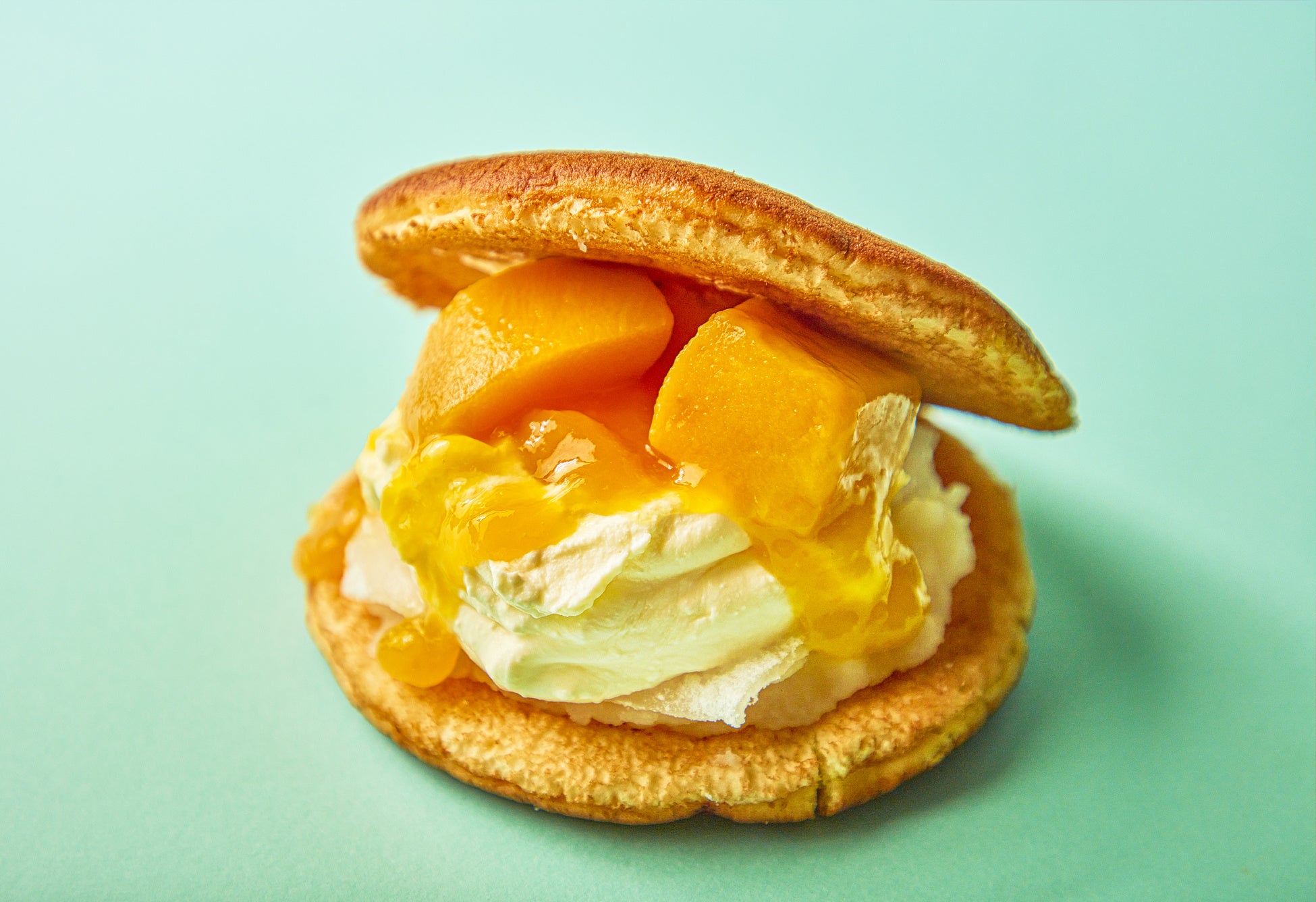さらに、トッピングのクリームチーズアイスが加わることで、初夏のこの季節にとっても嬉しい、口の中に広がる濃厚なコクと冷たさが感じられます。このアイスクリームは、マンゴーとの相性が抜群で、おいしさを引き立てます。最後に、マンゴージャムと新鮮なマンゴーがとろけ合い、豪華な仕上がりとなります。マンゴージャムの甘酸っぱさと、マンゴーのみずみずしさが、どらやき全体に奥深い味わいを与えます。