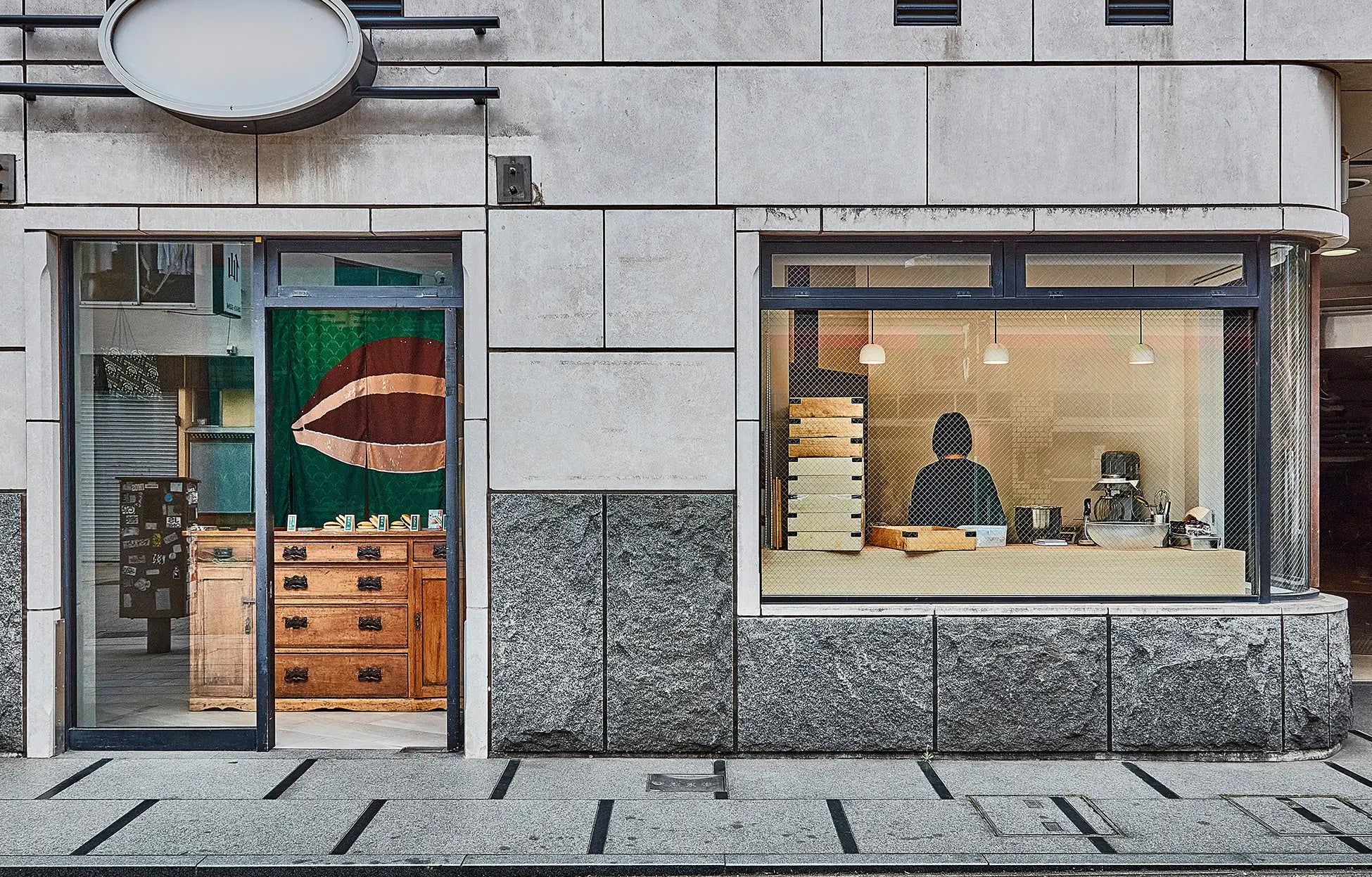 浅草の「門仲どらやき どら山 淺草工房」は、日本で最初の映画館と言われる石造りの電気館ビル1階を利用した店舗です。内装もシンプルで、建物の歴史と質感を活かしたデザインとなっています。