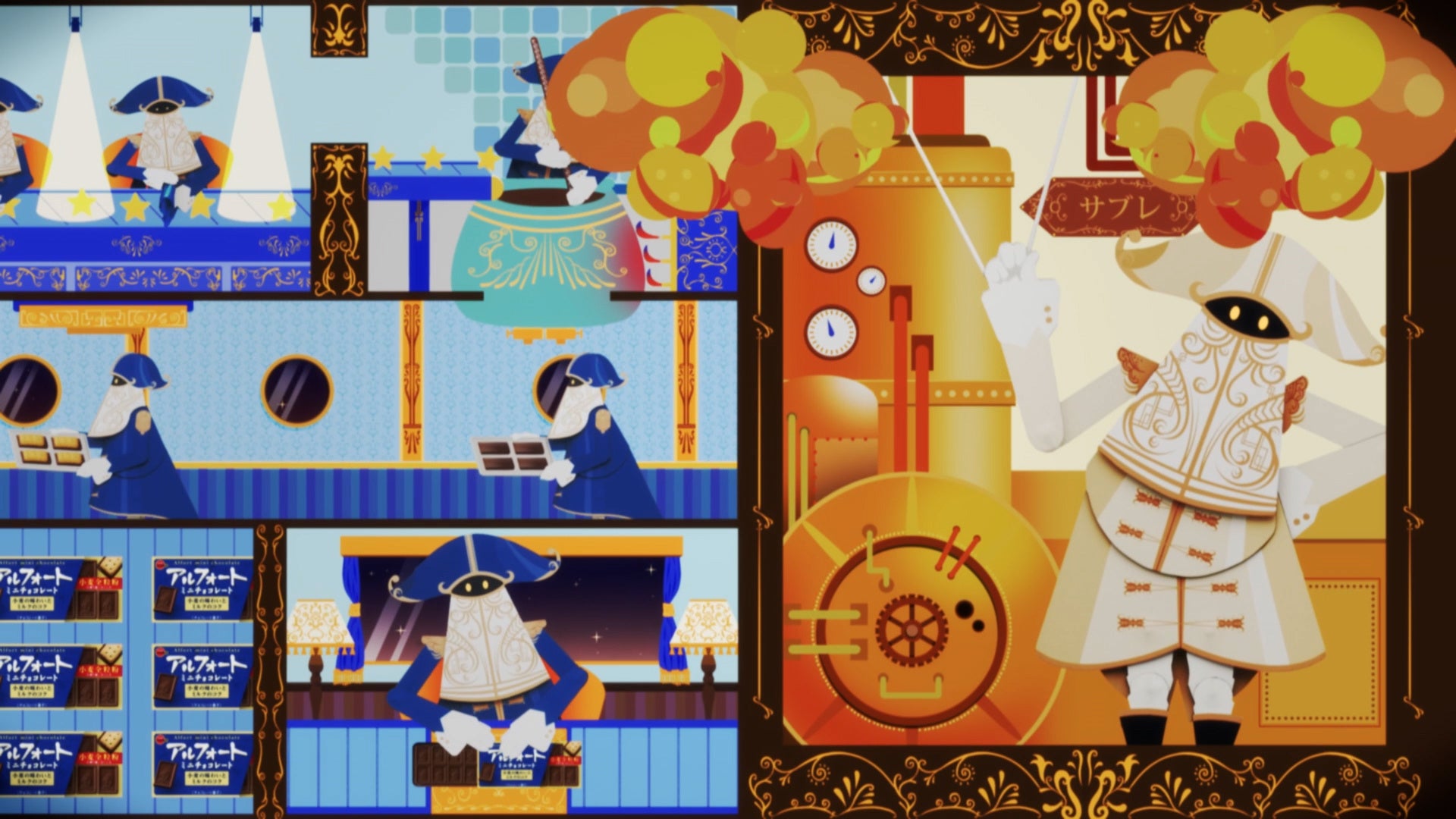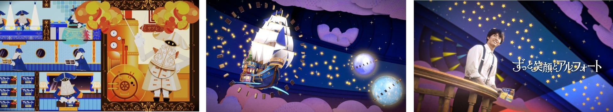赤楚船長が大きなベルを鳴らすと、可愛いらしい船員が現れ、慌ただしくも楽しそうにアルフォートミニチョコレートづくりを開始。最後に登場した船員の掛け声と共にブザーを鳴らすと、赤楚さんが鳴らしたベルが開き、中からアルフォートミニチョコレートが登場!アルフォートミニチョコレートを食べると赤楚さんの笑顔がはじけ、カラフルな宇宙空間が開きアルフォート号が進んでいきます。