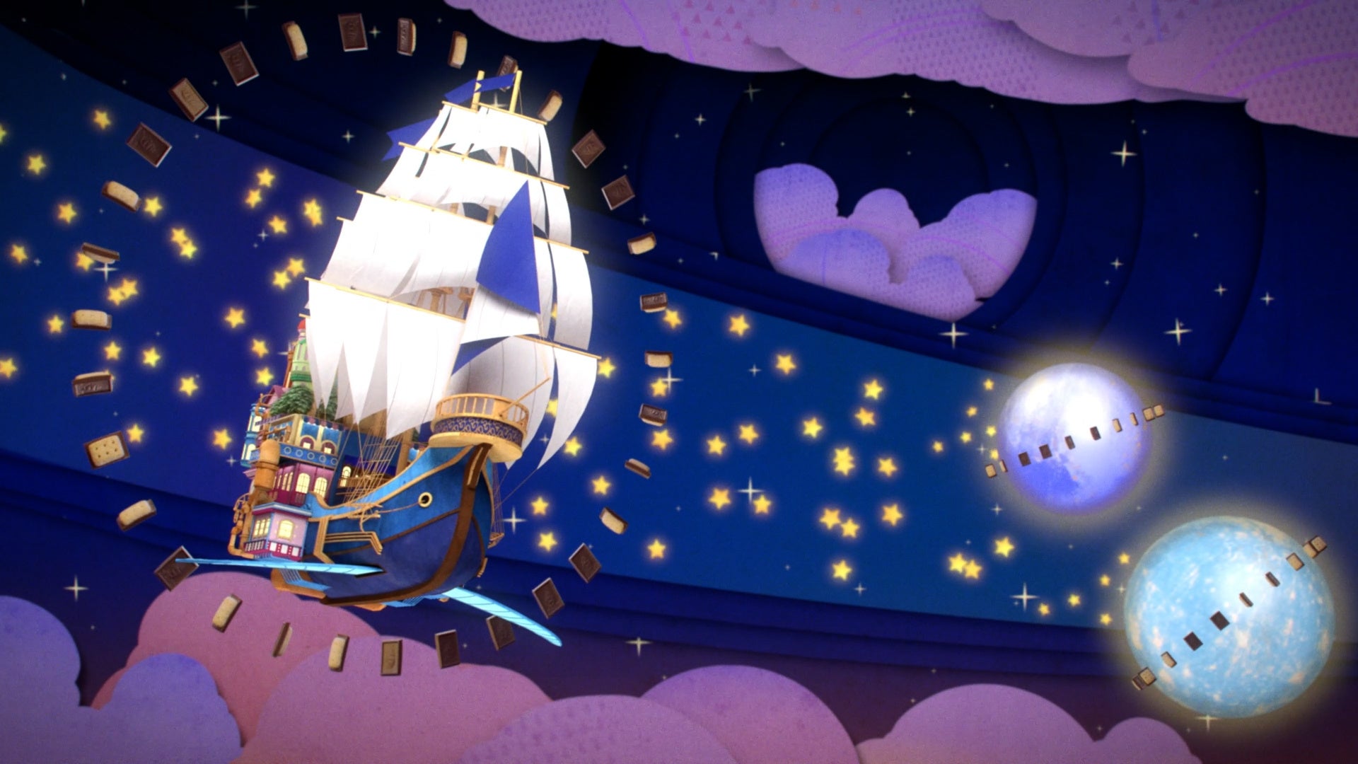 クラフトの宇宙を颯爽と進んでいくアルフォート号。赤楚船長が大きなベルを鳴らすと、可愛いらしい船員が現れ、木に実った星の果実からアルフォートミニチョコレートづくりが展開されます。最後に登場した船員の掛け声と共にブザーを鳴らすと、赤楚さんが鳴らしたベルが開き、中からアルフォートミニチョコレートが登場!
