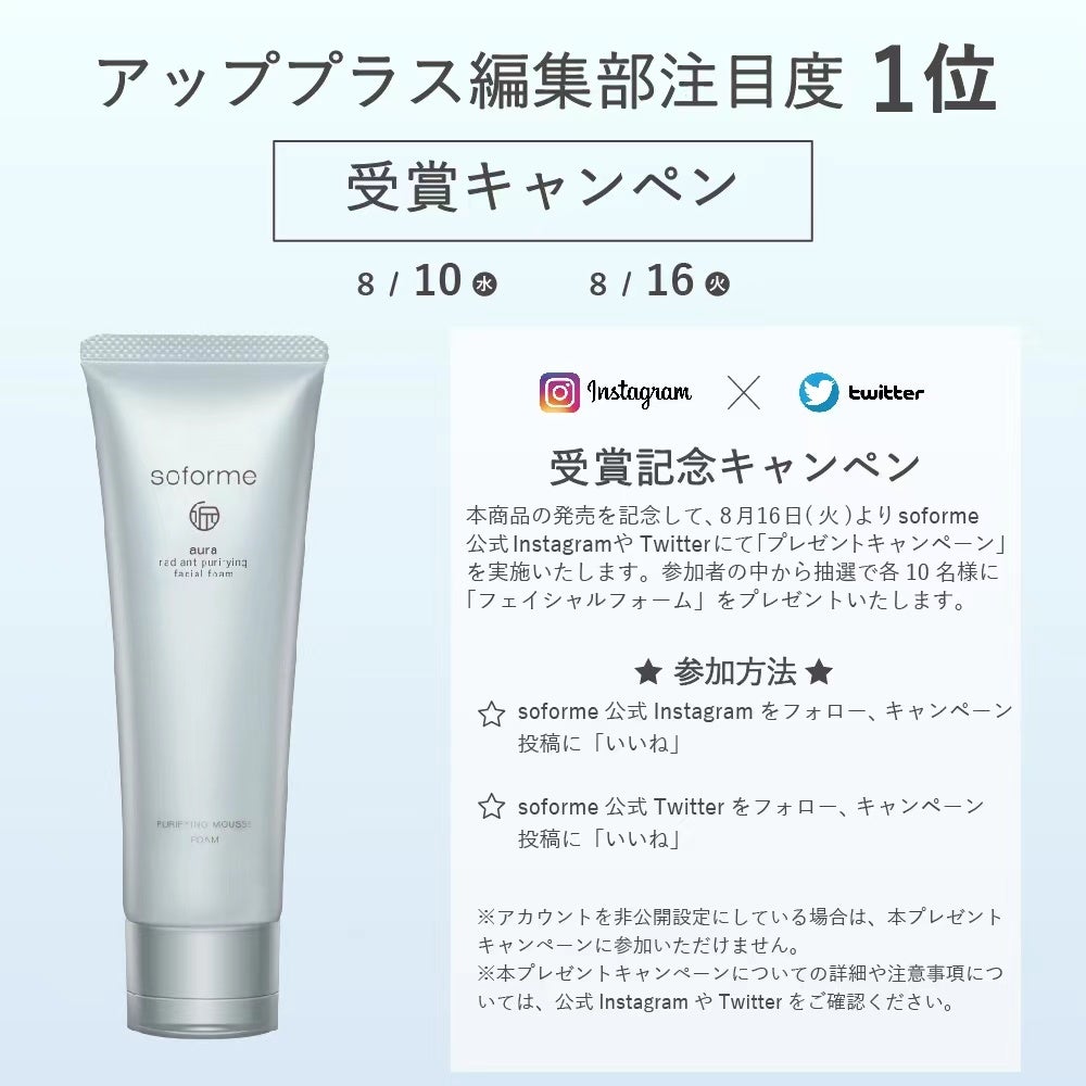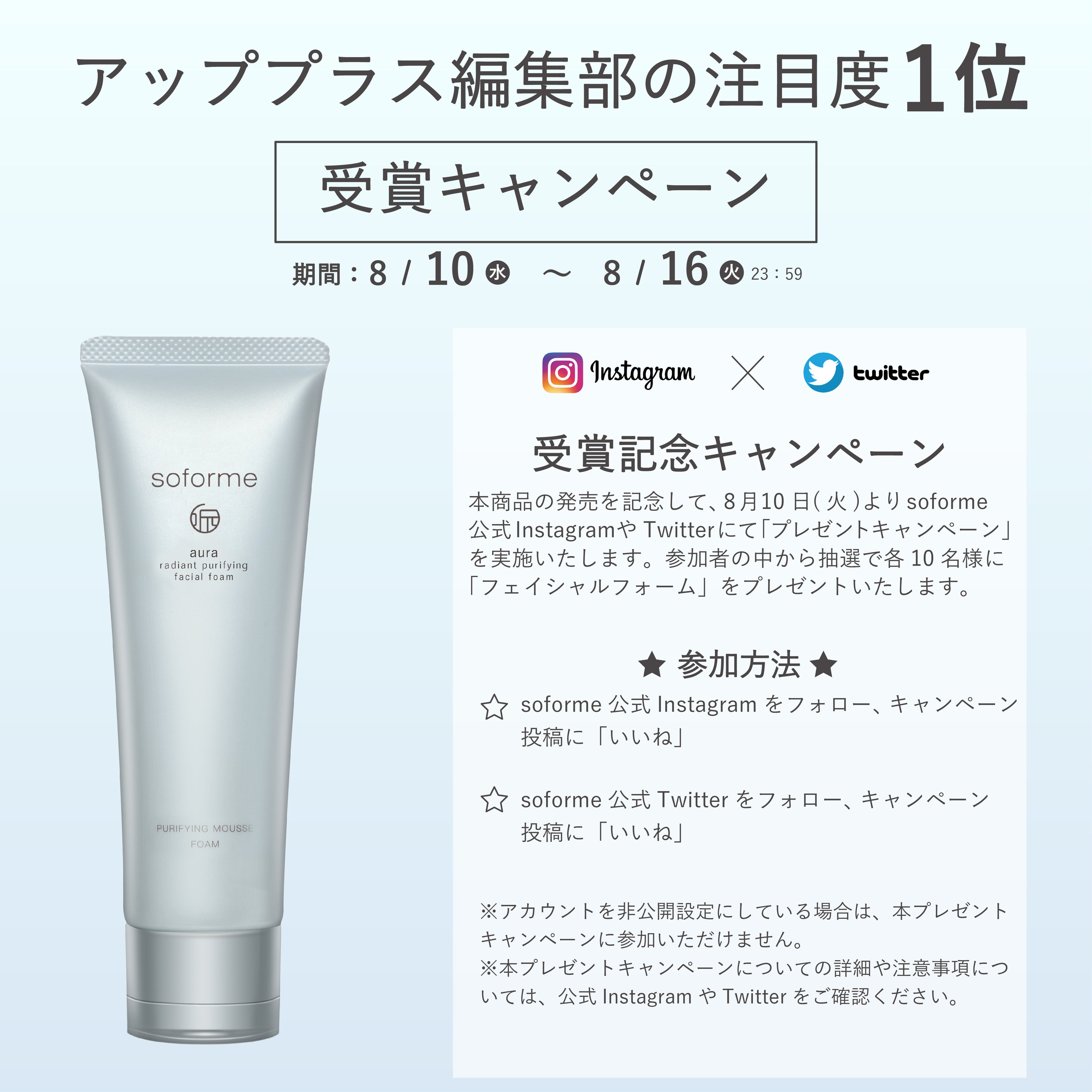 人気商品「soforme オーラーフェイシャルフォーム」が” アッププラス” 編集部の注目度No.1コスメ(洗顔部門)に選出されました!記念して8月10日(水)よりSNSキャンペーンを開催いたします!