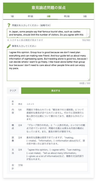 意見論述問題/Eメール問題/要約問題の3種類を順次公開中。問題・解答を画像アップロードするだけで、内容・構成・語彙・文法の観点からAIが評価。