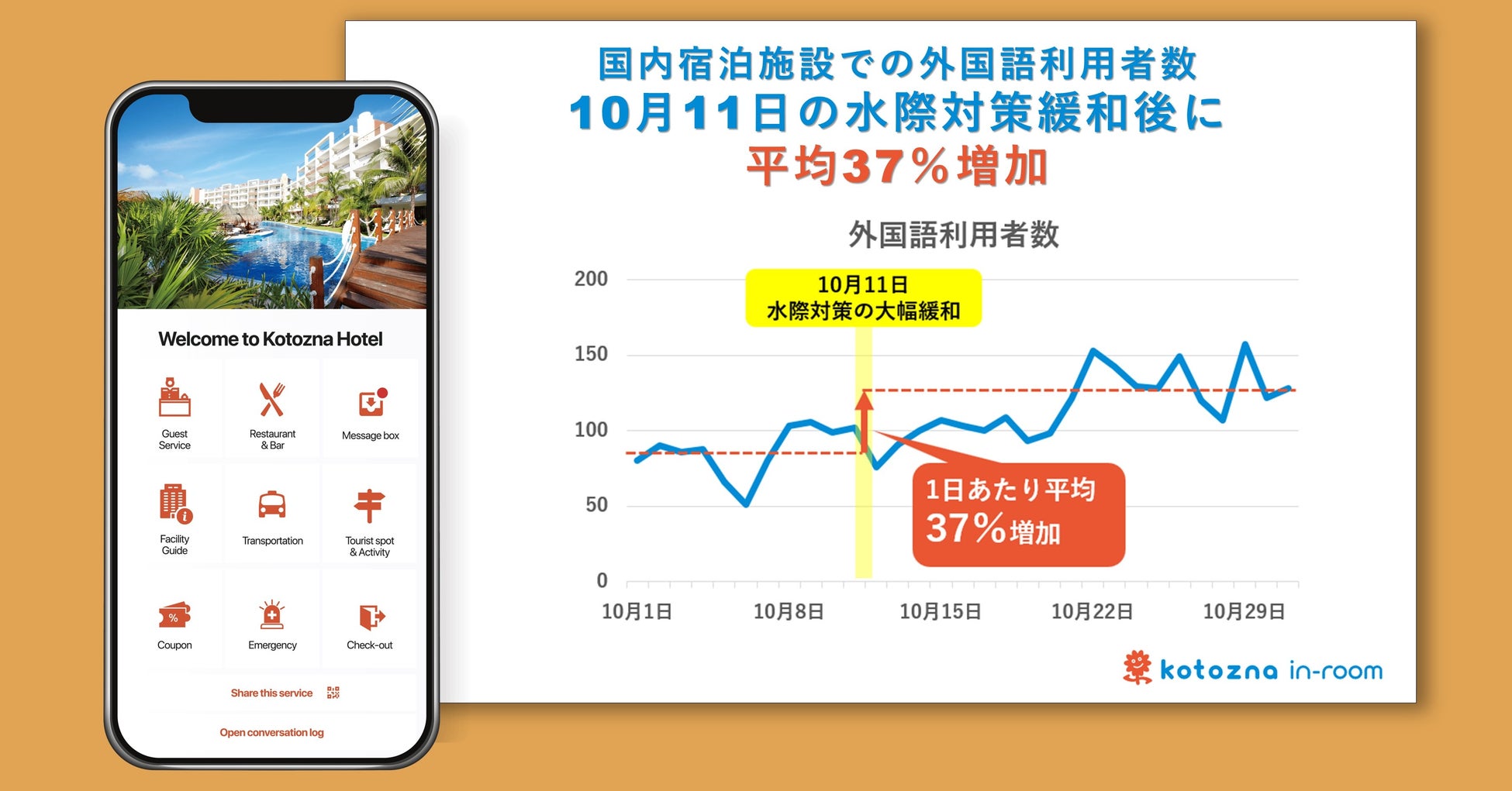 Kotozna株式会社(本社:東京都港区、代表取締役 後藤玄利、https://kotozna.com/ )は、当社が提供する宿泊施設向け多言語コミュニケーションツール「Kotozna In-room」利用データより、国内宿泊施設での外国語利用状況を調査しました。その結果、10月1日~10月10日と10月11日~10月31日で1日あたりの外国語利用者数の平均値を比較すると、10月11日の水際対策緩和後に平均37%増加していることが分かりました。個人旅行の解禁やビザ免除の再開によって、インバウンド回復に向けて確かな手応えを感じる結果となりました。