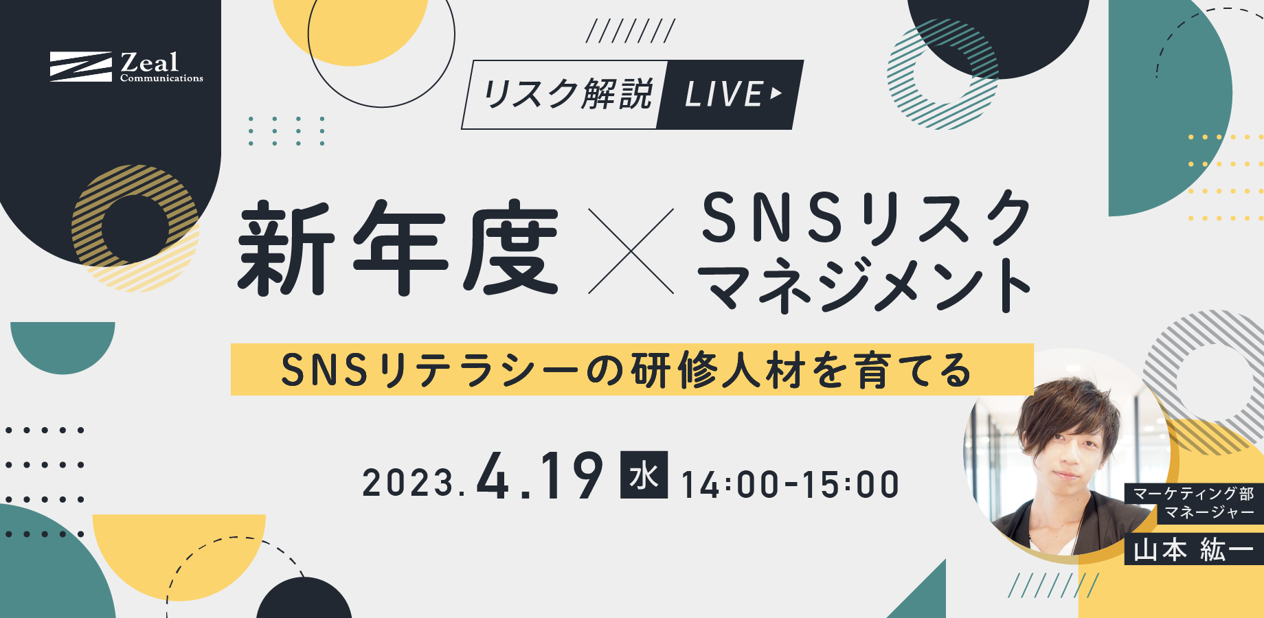 株式会社ジールコミュニケーションズ(本社:東京都渋谷区、代表:薮崎 真哉)は、2023年4月19日(水)14:00〜15:00、オンラインにて「【リスク解説LIVE】新年度×SNSリスクマネジメント~SNSリテラシーの研修人材を育てる~」セミナーを開催いたします。