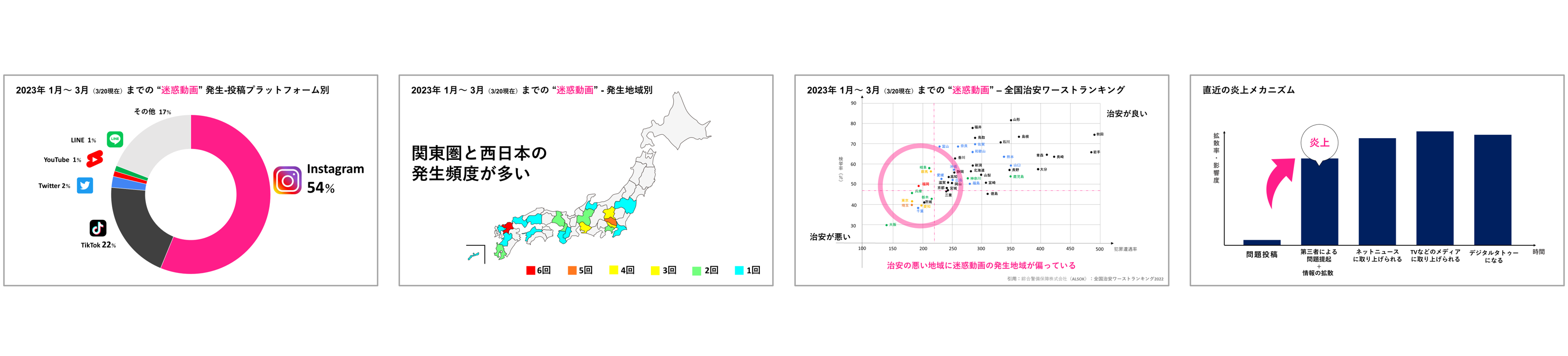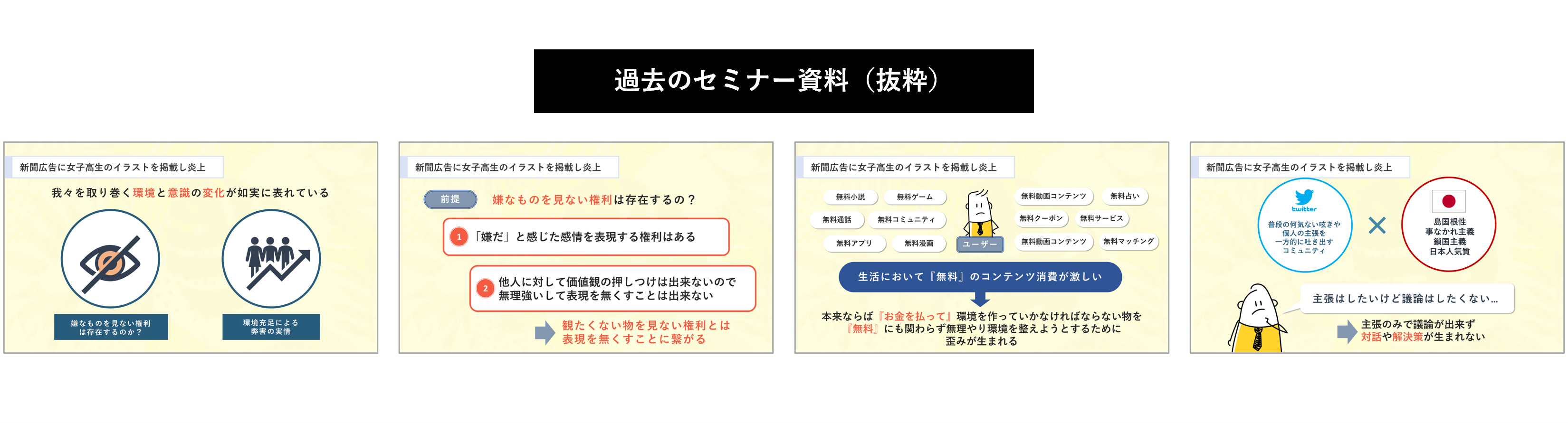下記の画像は以前開催したセミナー事例ですが、SNSプラットフォームの特性から国民性・哲学・時流などさまざまな視点から多角的な分析をおこない、SNSリスクのノウハウとして発信・啓蒙をおこなっております。深い分析と確かなデータによって裏付けされたナレッジセミナーは、毎月ご参加者様からご好評の声をいただいています。