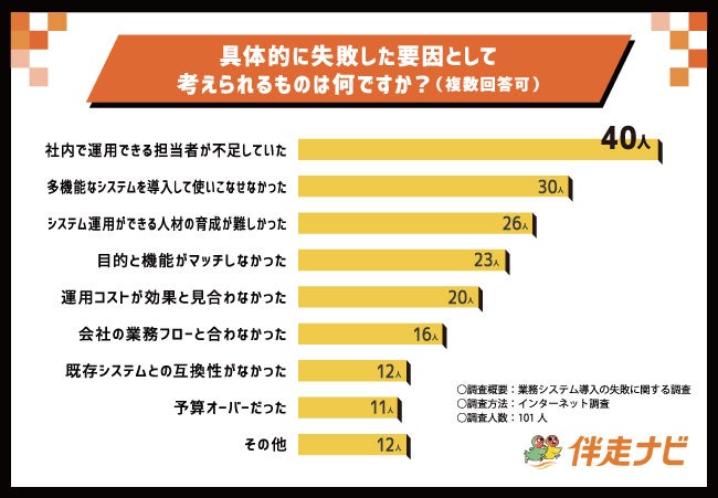 「従業員が使いこなせなかった」「システムを導入しただけになってしまった」「既存システムと互換性がなかった」など、さまざまな要因があったことが判明しました。