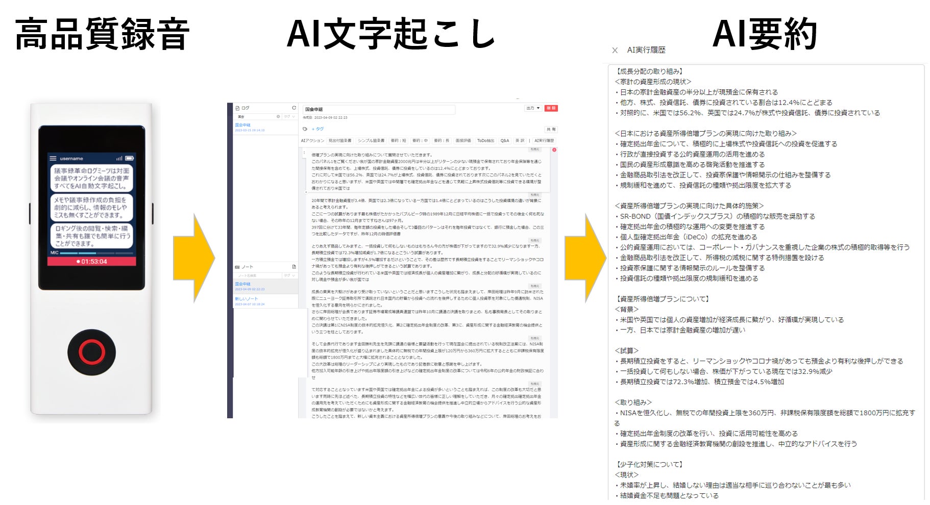 当社が提供するAI会議アシスタント「ログミーツ」は、230以上の自治体や数多くの企業で正式導入され、愛用されており、AI技術と独自モバイル端末を活用した高精度なAI文字起こしで会議やセミナーの記録・整理を効率化しています。「独自モバイル録音端末」「Windows用専用録音アプリ」「洗練されたウェブブラウザの編集画面」により対面会議もオンライン会議も高品質なAI文字起こし結果を実現し、お客様にご満足頂いております。多くの企業や自治体で導入実績のある「ログミーツ」は、最先端のAI技術を活用し、会議の生産性を最大限に引き出すサービスを提供し続けます。今後もお客様のニーズに応えるため、新機能の開発や改善に取り組んでまいります。