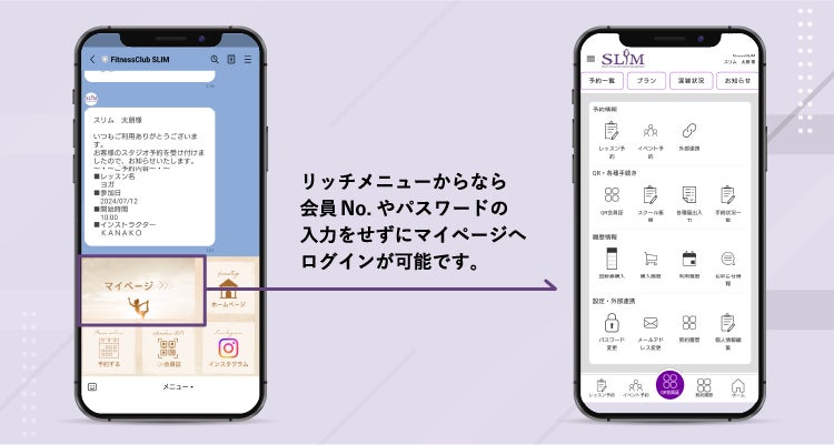 リッチメニューにマイページへのリンクを用意しておくことで、会員はSLIMの会員マイページにログインアカウントを入力することなくログインすることができるようになります。会員No.やパスワードを入力する手間を削減することで、より積極的なマイページの活用を促すことができます。
