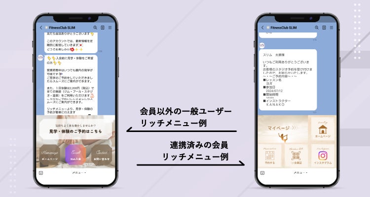 リッチメニューはLINE公式アカウントのトーク画面下部に表示されるメニュー機能です。SLIMからリッチメニューを作成することで、会員と会員以外の一般ユーザーとで、リッチメニューを出し分けることができるようになります。会員には利用促進するためのリッチメニューを、一般ユーザーには入会を促進するためのリッチメニューを表示するなどの出し分けが可能になり、LINE公式アカウントを友だち追加したユーザーに、よりリッチな体験を提供できます。