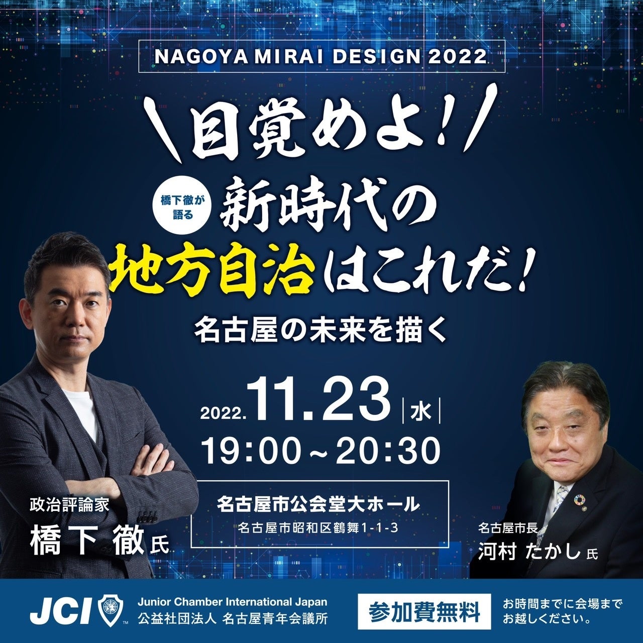 対談の部では、名古屋市長の河村たかし氏をお招きし、当青年会議所の高橋理事長が名古屋の未来についてお聞きします。