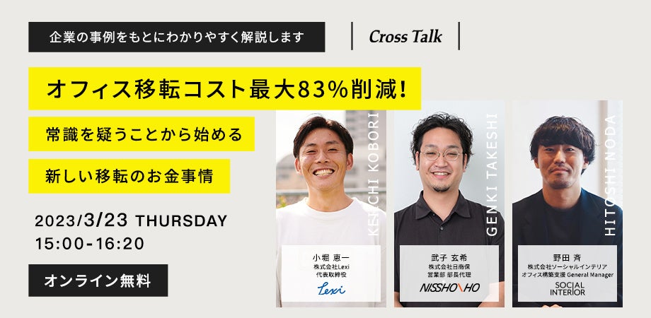 ビルオーナーと企業が直接つながるオフィス検索サービス「SERECT」を運営する株式会社Lexi(東京都渋谷区、代表取締役:小堀 恵一、以下Lexi)が株式会社ソーシャルインテリア(東京都港区、代表取締役:町野 健、以下ソーシャルインテリア)と株式会社日商保(東京都港区、代表取締役社長:豊岡 順也、以下日商保)とタッグを組み、合同ウェビナーを開催いたします。