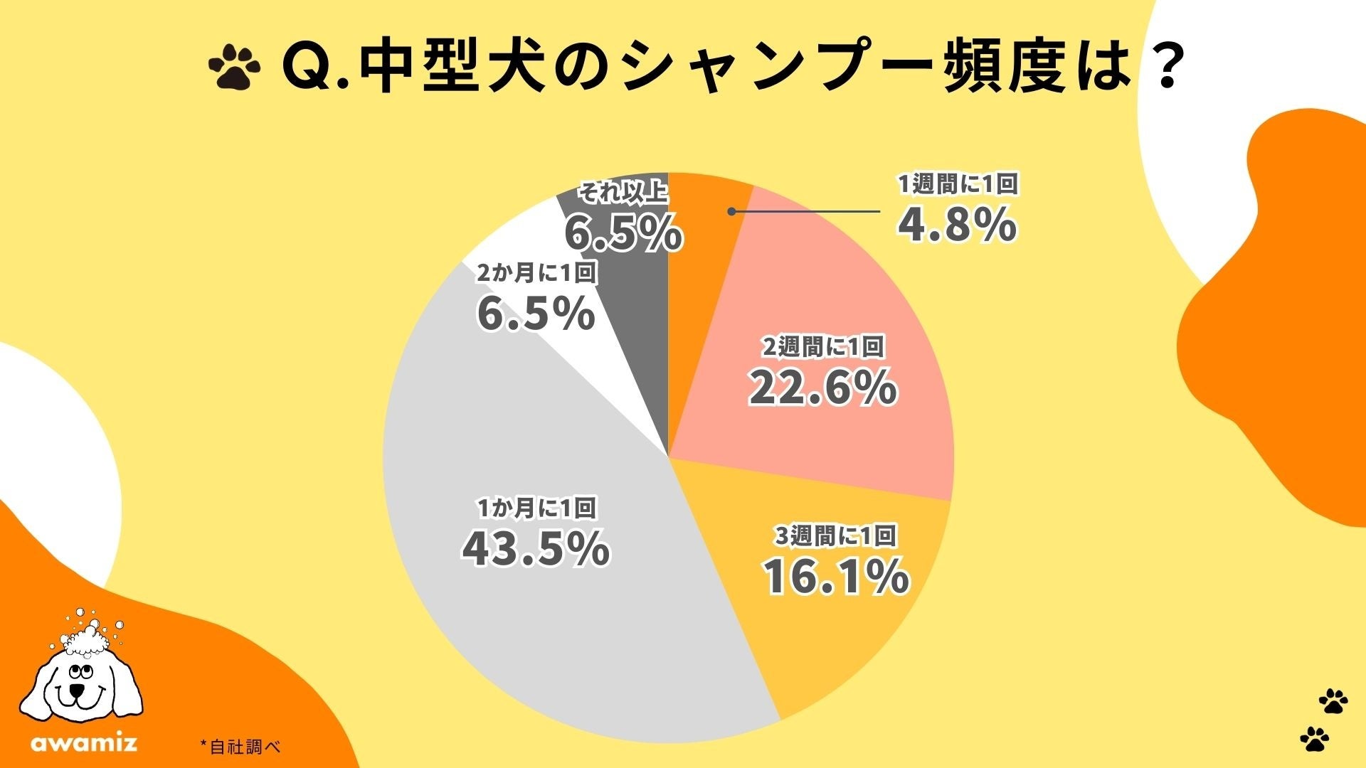 中型犬のシャンプー頻度について調査に参加した飼い主の43.5%が「1か月に1回」のシャンプーと回答しました。中型犬は運動量も多いですが、健康状態が良好であれば、月に1回程度のシャンプーで問題なさそうです。ワンちゃんの体調に合わせて獣医に相談しながら、シャンプーをしましょう。