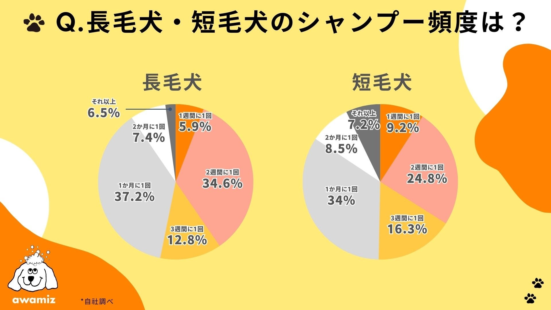 短毛犬と長毛犬においても、1か月に1回のシャンプーが一般的なようですが、長毛犬は被毛の特性から、より頻繁なケアが必要とされていることがアンケート結果に表れてますね。