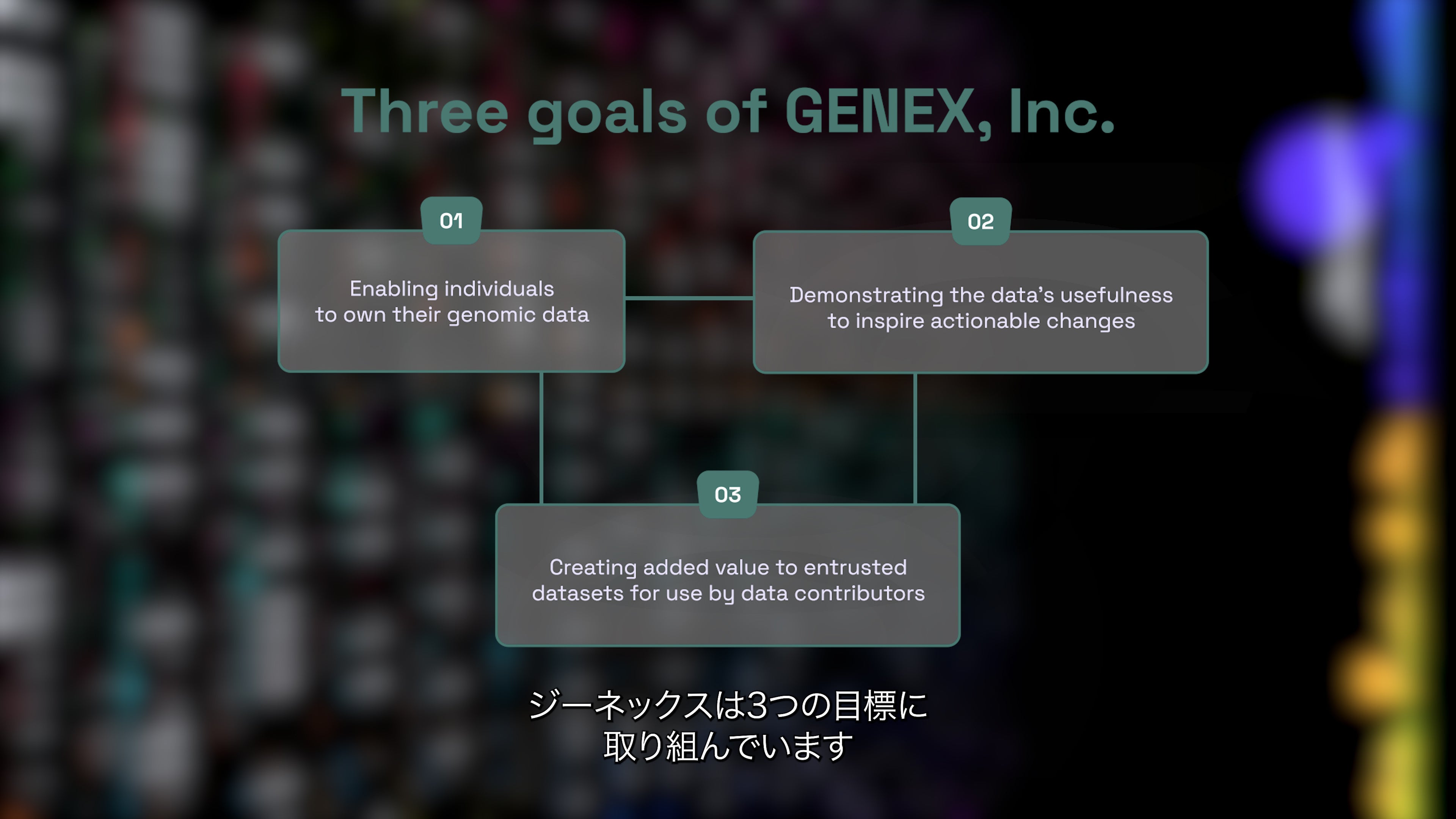 本動画は、米国生物物理学会年次総会用に制作したため、英語音声・日本語字幕となっています。本編は当社代表の八木のほか、研究開発部門執行役員の梅原 千慶、さらに順天堂大学 難病の診断と治療研究センター長の岡﨑 康司教授のコメントを中心に構成しています。フルバージョンとダイジェスト版の2種類をご用意しています。当社が掲げる『個人志向のゲノムプラットフォーム』のコンセプトに共感し、連携を希望される法人様におかれては、当社ウェブサイト等を通じてのご連絡をお待ちしております。