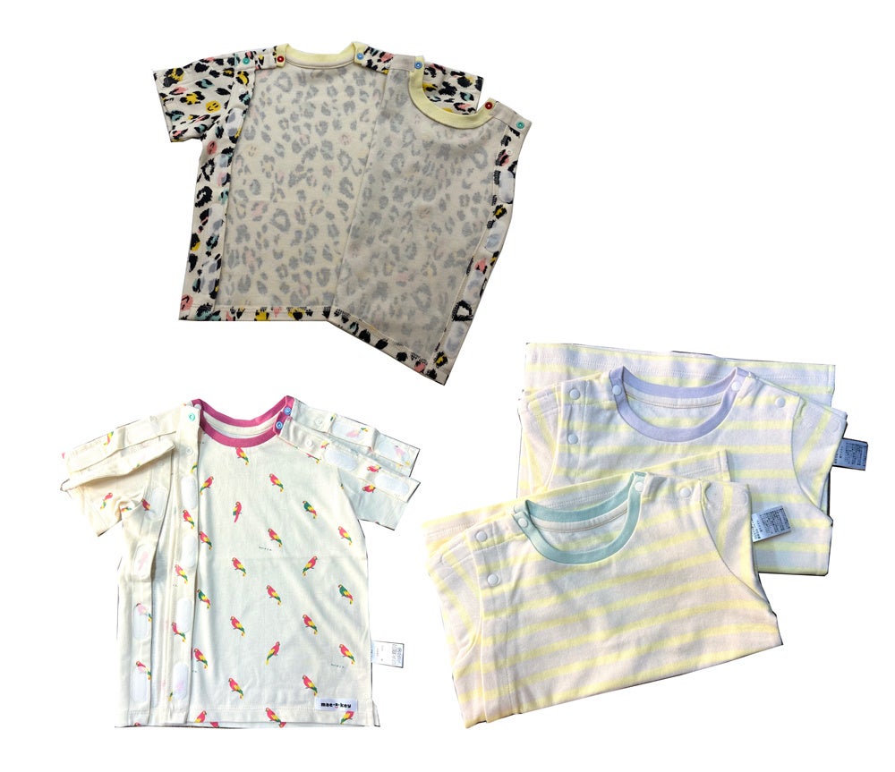 着脱がしやすいように肩も開くので、点滴をした状態でも酸素チューブをした状態でも簡単に着替えが出来ます。ボタン部分はプラスチックスナップを使用し、色違いにする事で着替えをスムーズにすることができます。前開き部分の身頃と袖には、柔らかい面ファスナー(マジックテープ)を使用しています。タグは外側に着け、肌に当たらないようにしています。