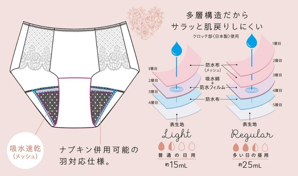 | 特徴 | 普通の日用。4層の多重構造で、ナプキン約2枚分の液体(約15ml)を吸収。多い日は、お好みの生理用品と併用可能の羽対応仕様。 | 多い日の昼用。5層の多重構造で、ナプキン約4枚分の液体(約25ml)を吸収。多い日は、お好みの生理用品と併用可能の羽対応仕様。 |