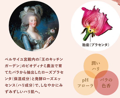 長きにわたり、上流階級を虜にしてきた、ベルサイユ宮殿の「王のキッチンガーデン」。そんな特別なガーデンで、有機農法の頂点と言われるビオディナミ農法によって丁寧に育てられたバラを手摘みにて収穫。その胎座(プラセンタ)を培養し、自然発酵、低温蒸留を経て、手間ひまかけて得られた豊富な菌活成分と栄養分を含むローズプラセンタ(ハリ成分)と発酵ローズエッセンス(保湿成分)がこのシリーズの鍵。女性らしさの象徴、希少かつ高貴なバラがもつパワーを余すところなく引き出した美容成分が、デリケートゾーンを満たします。