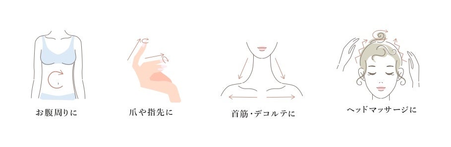 指先、こめかみ、首筋やデコルテ、お腹周りなど気持ちいところに、容器を肌に垂直に当て、強く押し当てずにやさしくローラーを転がしてご使用ください。コロコロとマッサージするように塗るのがおすすめです。