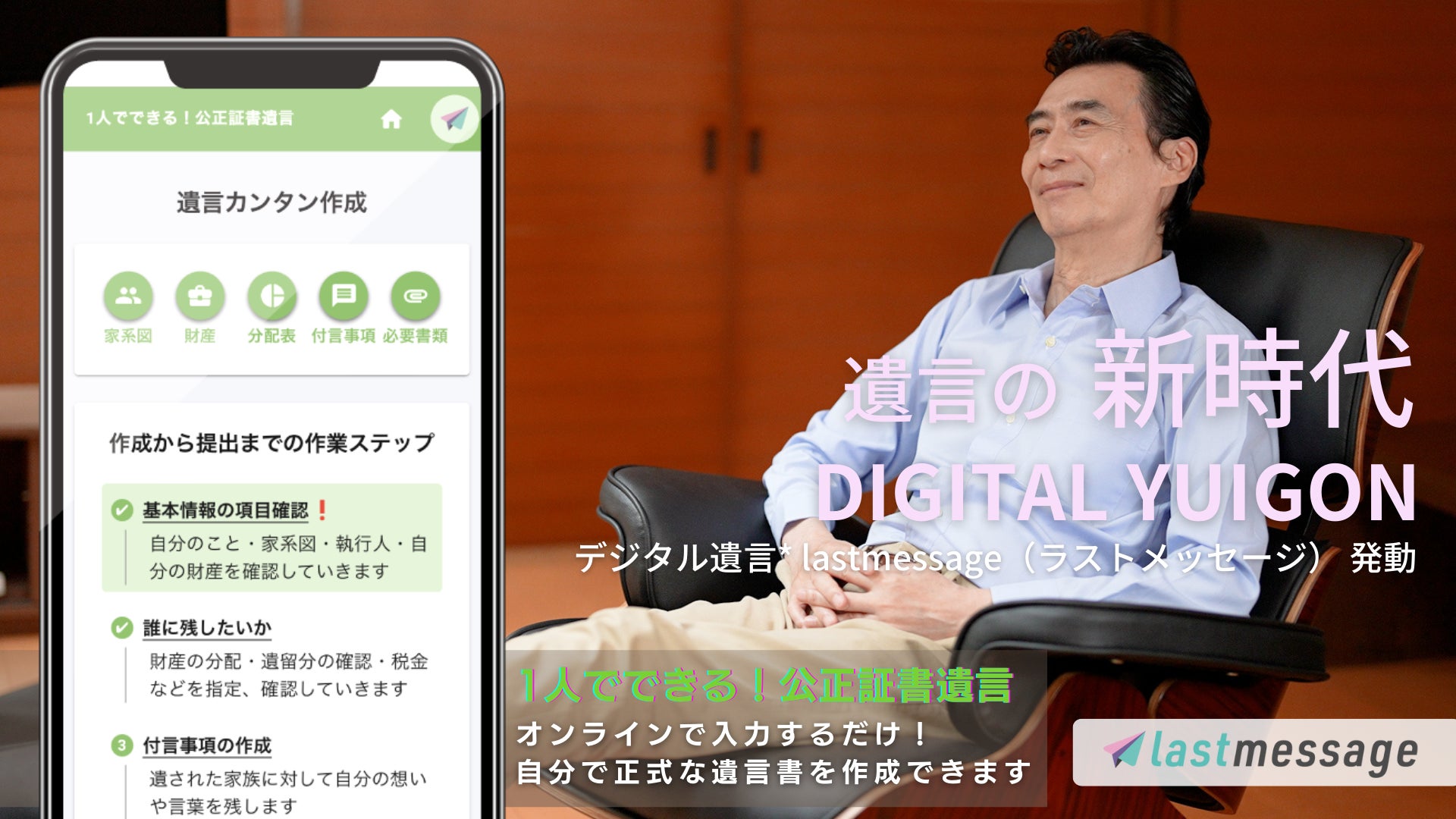 この【1人でできる!公正証書遺言】を利用することにより、一般的なご家庭でも、所有する財産の額にかかわらず手軽に、そして格安に公正証書遺言を作成できるようになります。これにより「デジタル遺言*」と、法的な効力をもつ遺言書「公正証書遺言」のどちらも『lastmessage(ラストメッセージ)』で選択できるようになりました。