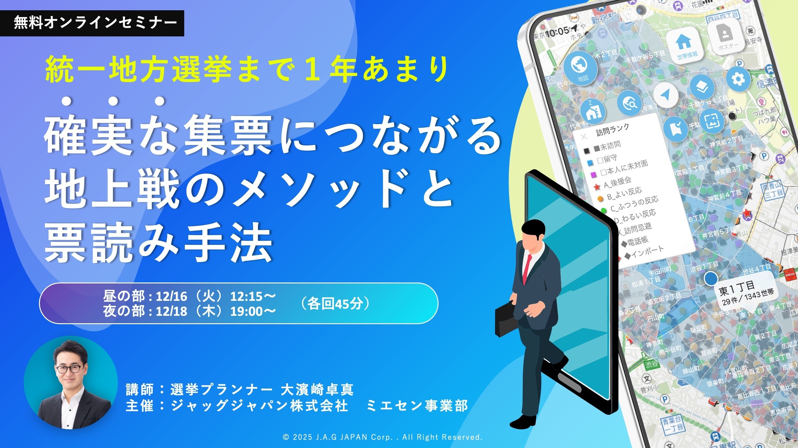 ジャッグジャパン株式会社(本社:東京都渋谷区、代表取締役:大濱崎卓真)は、2027年の統一地方選挙を見据え、地方選挙における戸別訪問メソッドと票読み手法を解説する無料オンラインセミナーを2025年12月16日(火)、18日(木)に開催いたします。
