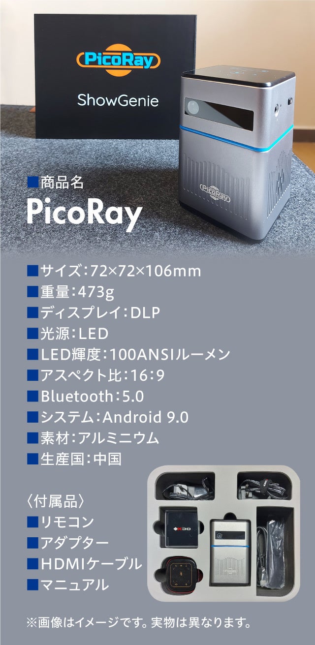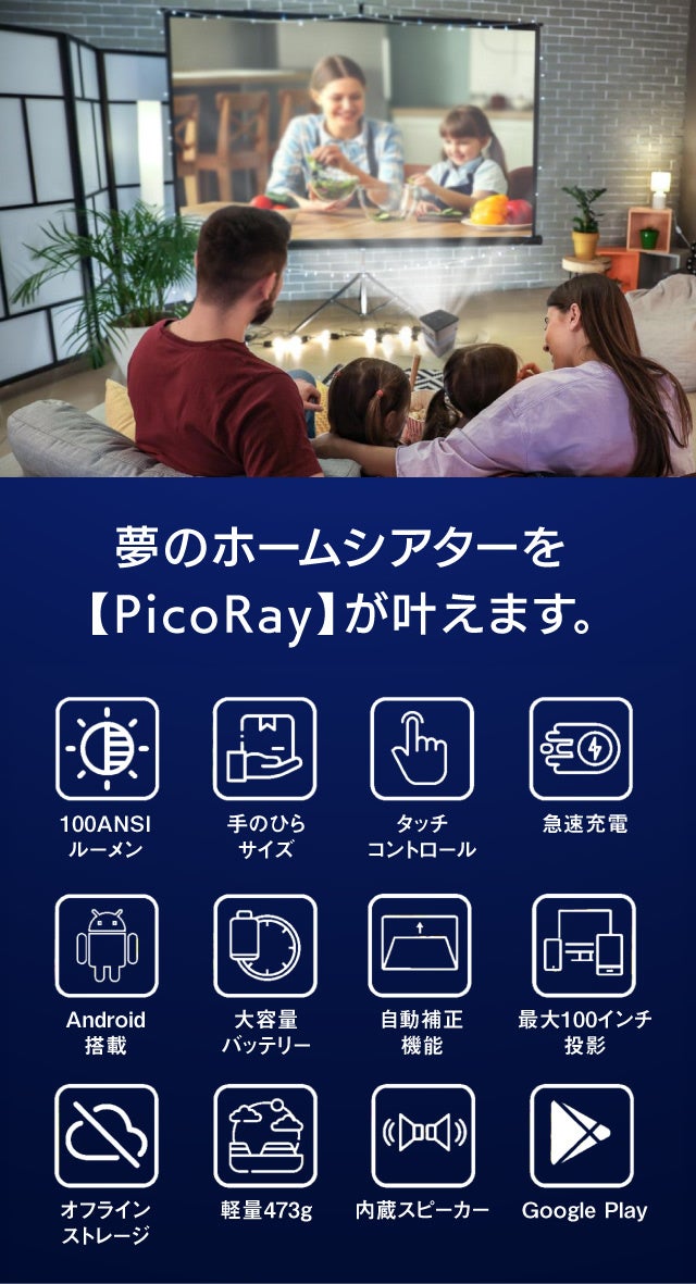 【PicoRay】は最大100インチもの大画面で動画やゲームが楽しめる、手のひらサイズのポータブルプロジェクターです。