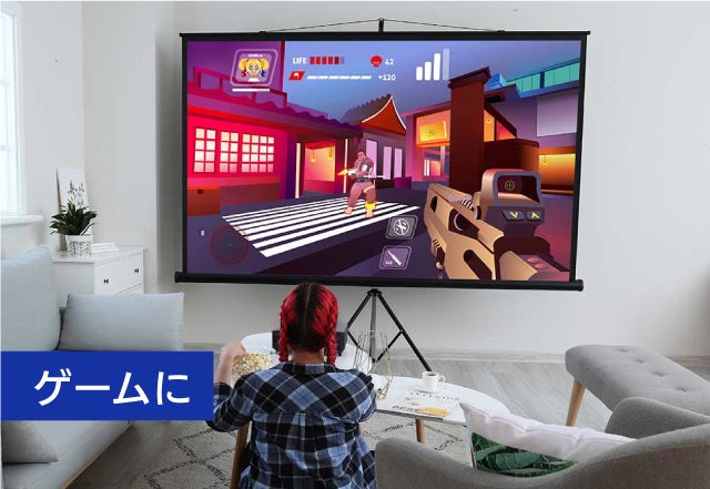 スクリーンの位置によってプロジェクターを置く台の角度を調整する必要が無く、スクリーンに投影すればすぐに映像の視聴が可能。