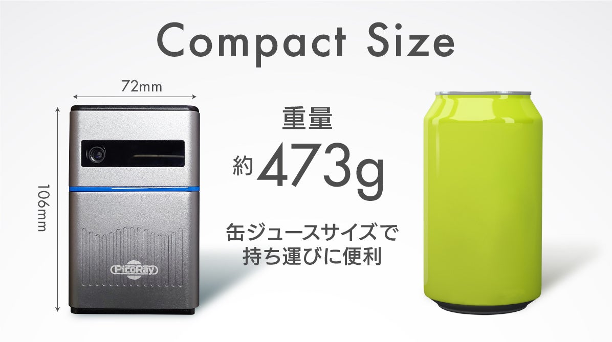 【PicoRay】は350ml缶とほぼ同じサイズのポータブルプロジェクターです。
