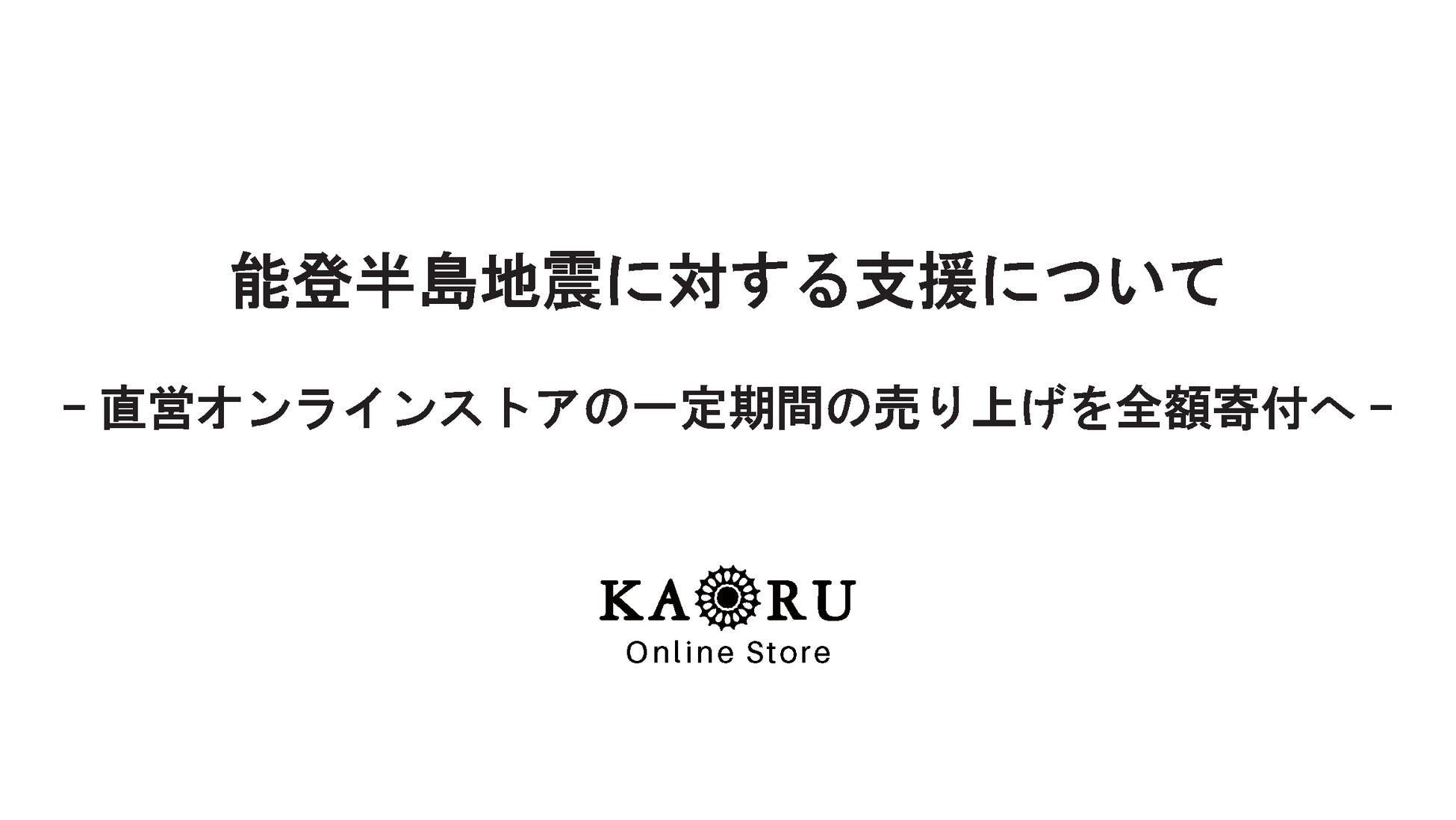 KAORUでは、今回の地震で被災された方々や被災地の支援を目的に、2024年1月13日(土)~1月15日(月)期間中の直営オンラインストア「KAORU Online Store」の売り上げ全額を、石川県に寄付させていただきます。