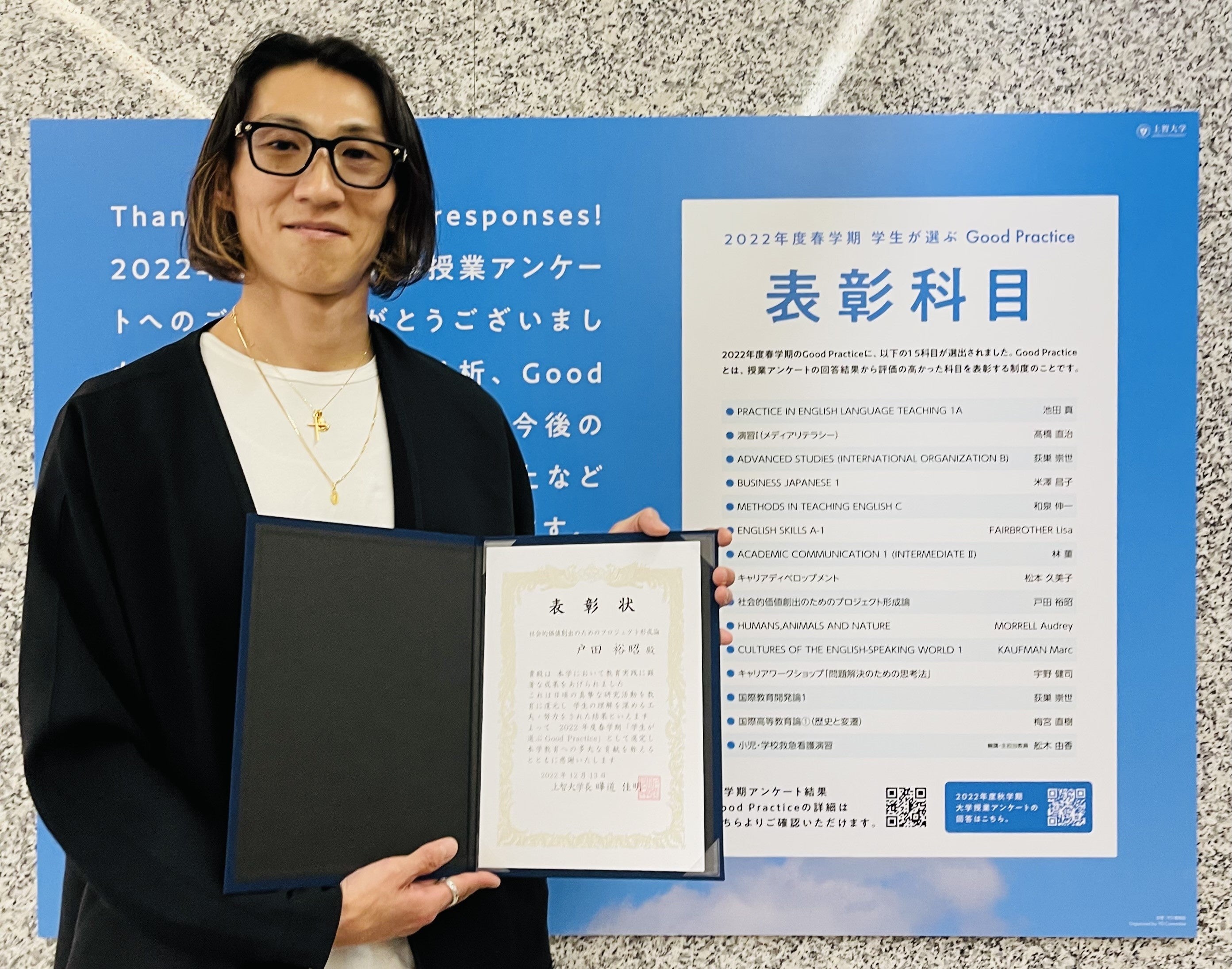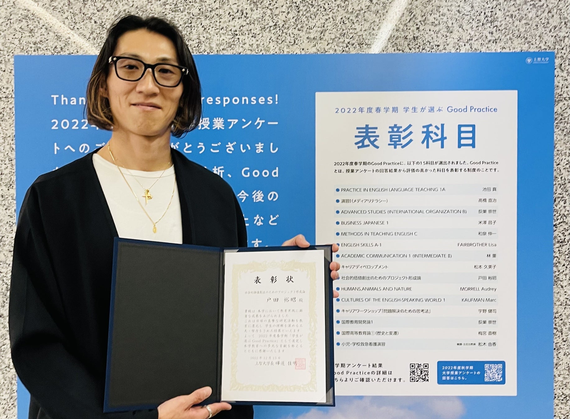 グッドプラクティスとは、上智大学において実施されている表彰制度です。全学共通科目を対象とした授業アンケートを受講学生に実施し、評価が特に高かった科目の担当教員が選考・表彰されます。今期は全科目が対象となった中から約1%が受賞し、「社会的価値創出のためのプロジェクト形成論」も選ばれました。