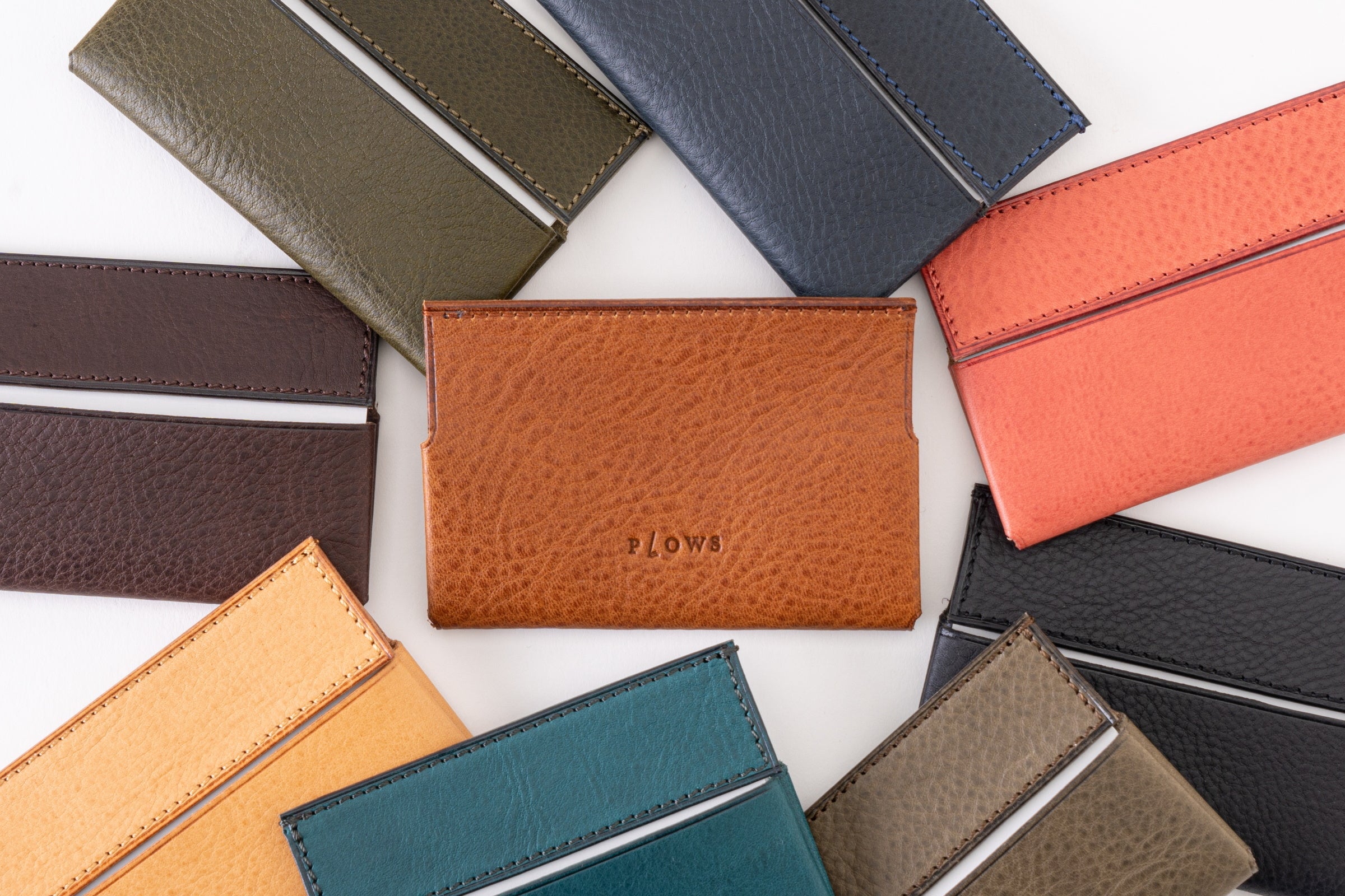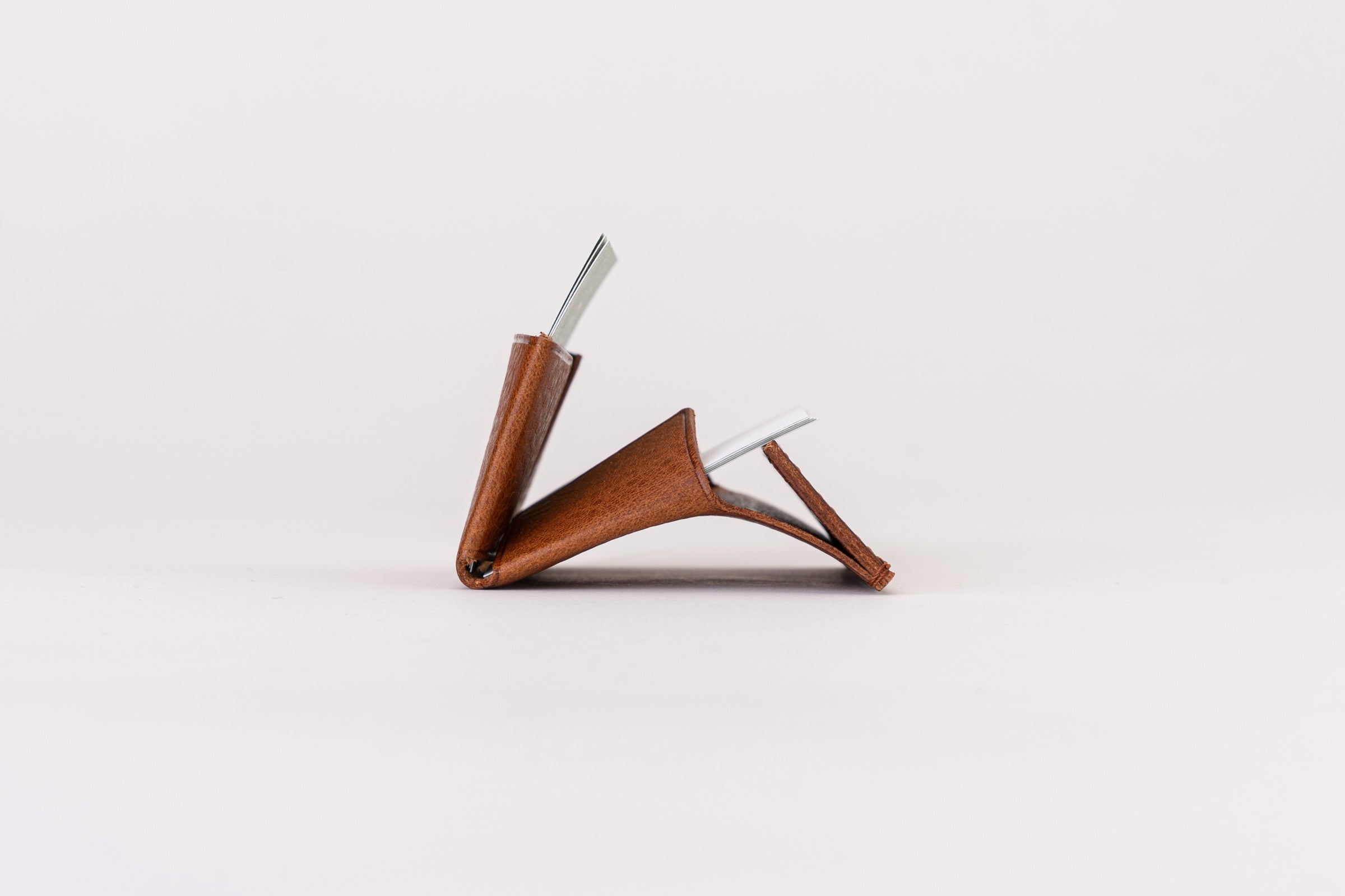 本体はたった一枚革を折り紙のように折り込み立体的に仕立て、これ以上ない程シンプルに仕上げました。外側は装飾を排し革の表情が楽しめるデザインになっています。開いた時も主張しすぎないシンプルデザインになっているので男女問わずご使用していただけます。