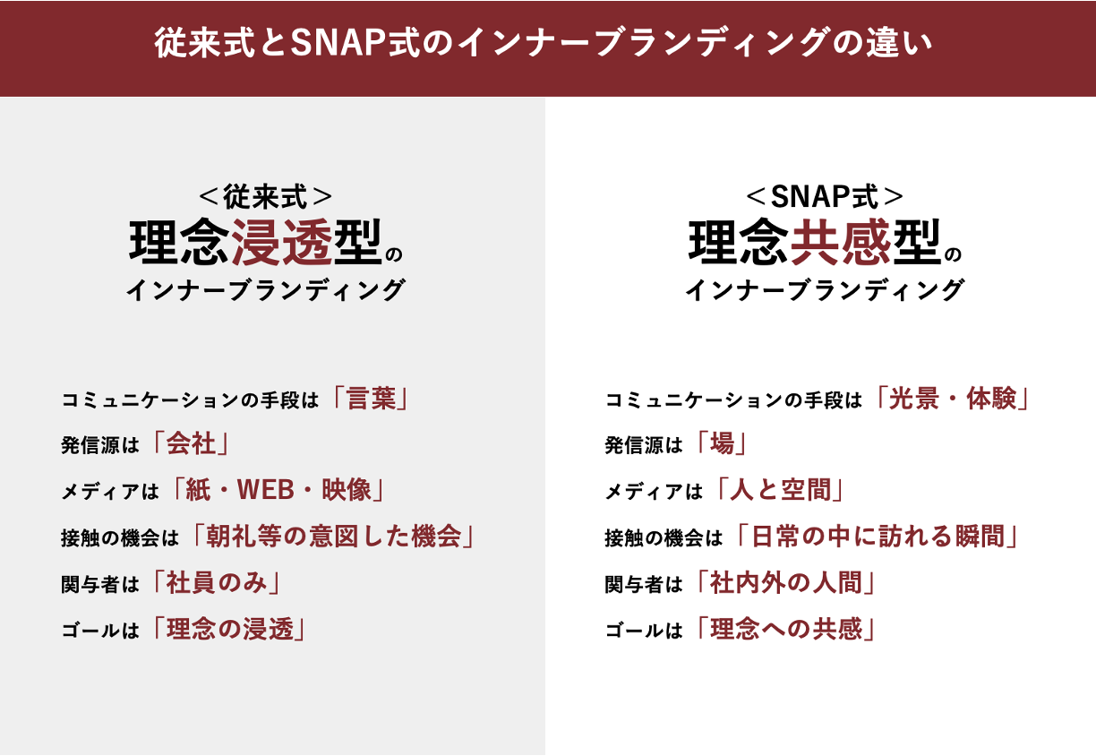 そんな中、コロナ禍を機に「オフィスのあり方」を見つめ直し、体験を通じて「理念への共感を育む場所」として生まれたのが、SNAPです。地域の方々・お客さま・パートナーさまなどと、SNAPの空間やコンテンツを通じてつながり、これまでになかった新しい取り組みに展開していく。日々この場所で生まれる「幸せなつながり」を社員に体験してもらうことで、単なる言葉の共有だけではない、実感をともなうインナーブランディングが可能となります。