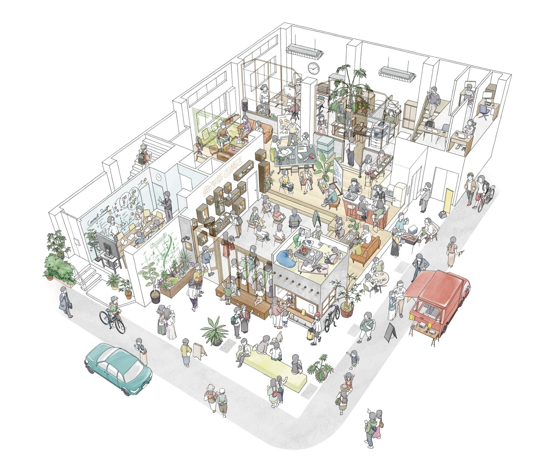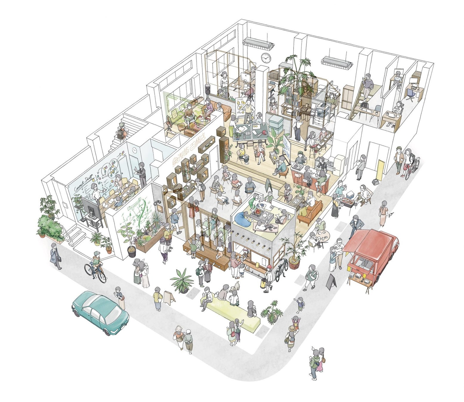 社員がオフィスにいるだけで、会社理念を日常的に体感できる仕掛け。オフィスレイアウトを見ると、スペースの半分以上(もっと言うと七割方ほど)は外部の方が入れるスペースとなっている。さらに街行く人が自由に腰かけできるベンチの設置、常設のカフェもあり常時外部とのつながりがある驚きのレイアウトとなっている。 大胆な発想で「つながりのデザイン」を体現しており、わざわざ足を運んでみたいと感じるほど。新型コロナウィルスの感染拡大をきっかけにオフィスのお引越しをされた同社。想定外の出来事をチャンスに変える力に勇気をもらえる取組となっている。