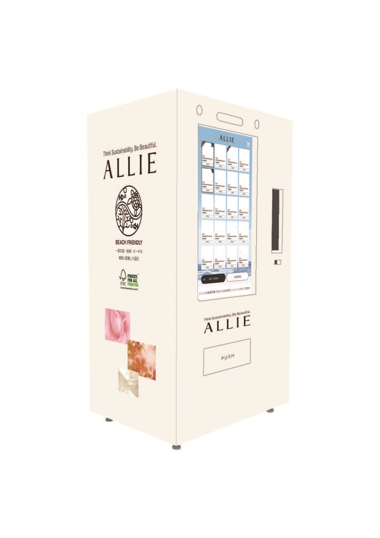 また、パッケージには環境に配慮した素材を採用するなど、リニューアルしたALLIEのサステナブルなコンテンツ動画を視聴しながら購入できる自販機を設置。