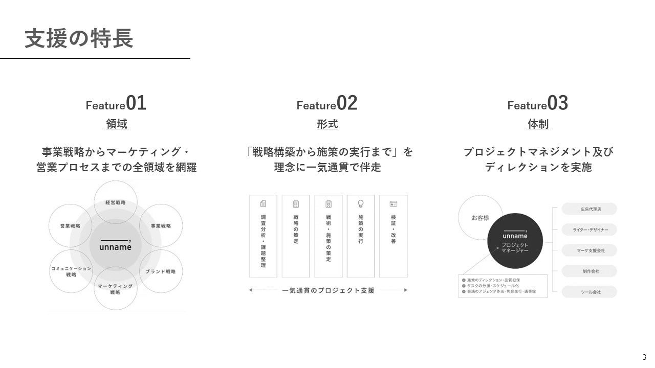 unnameでは2019年の創業以来、一貫して企業のマーケティング支援に取り組んで参りました。様々な企業の方から“マーケティング”や“事業成長”に関するご相談をいただき、多くの企業のマーケティング活動を支援して参りました。その中で、手法から出発せず課題に基づいてソリューションを構築する“コンサルティング”の視点を持ったマーケティングソリューション提供の必要性を強く認識するに至りました。
