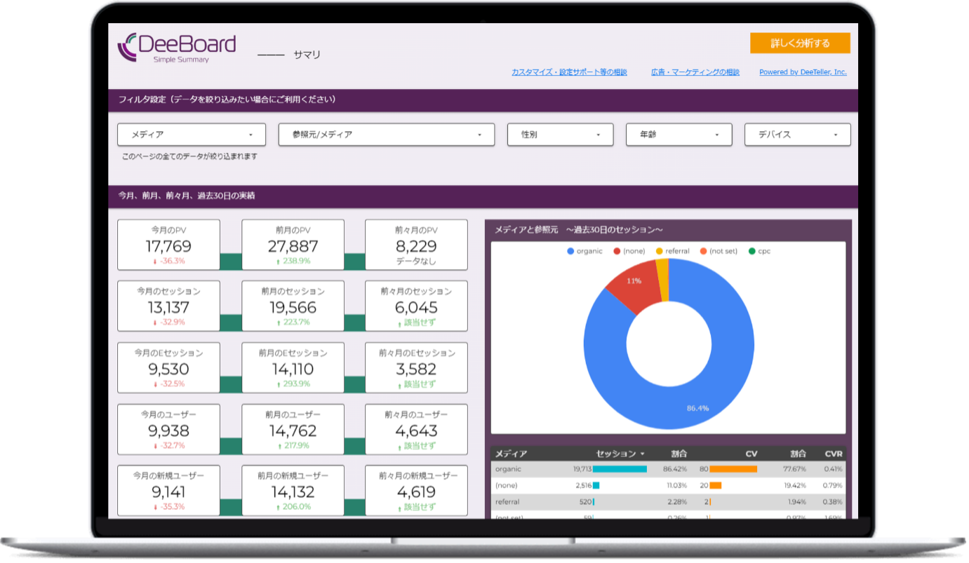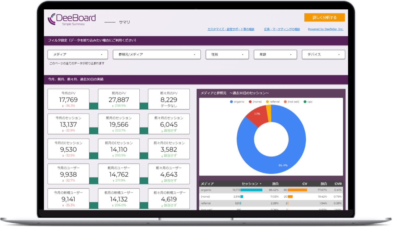『DeeBoard Biz』は、Looker Stuido(ルッカースタジオ)で作成されたアクセス解析レポートです。Googleアナリティクスのアカウントと連携することで、タグを設置することなく、すぐにご利用いただけます。