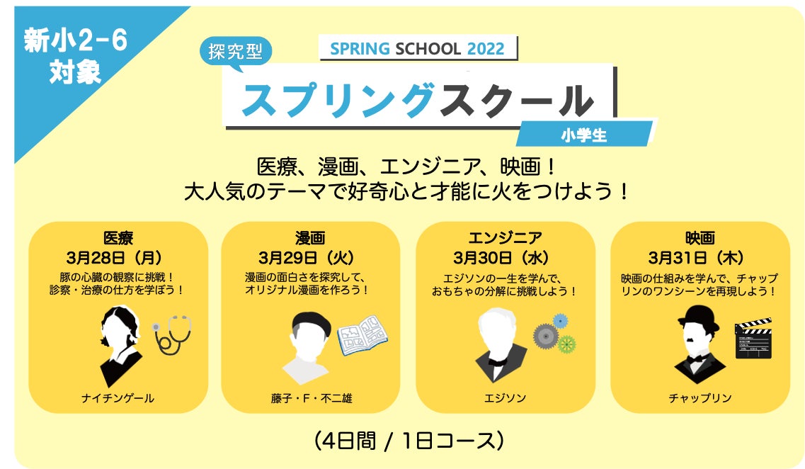 「医療」「漫画」「エンジニア」「映画」をテーマに好奇心と才能に火をつける点火プログラムを実施します。通年クラスでも大人気なテーマをご用意しました。