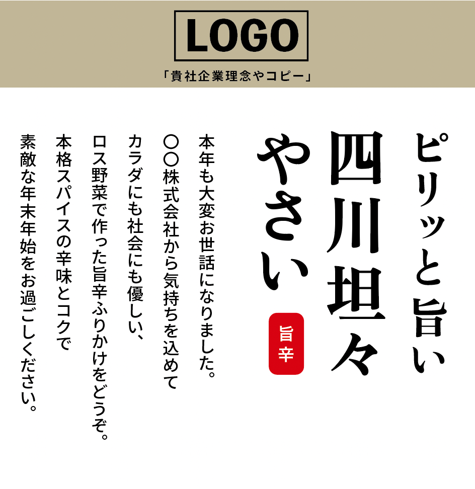 - デザインカスタム:各社指定のロゴ/コピー/挨拶文を無料提案