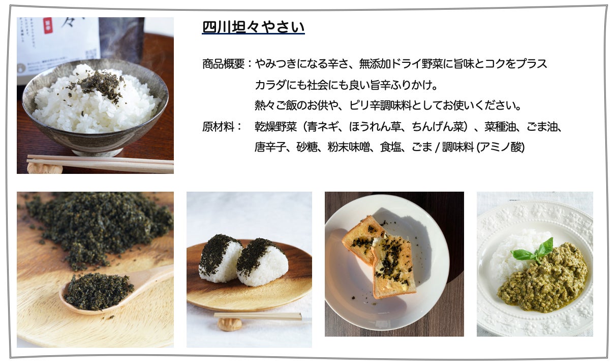 - 商品概要:無添加ドライ野菜に旨味とコク、やみつきになる辛さをプラスした、カラダにも社会にも良い旨辛ふりかけ。熱々ご飯のお供や、ピリ辛調味料としてお使いください。