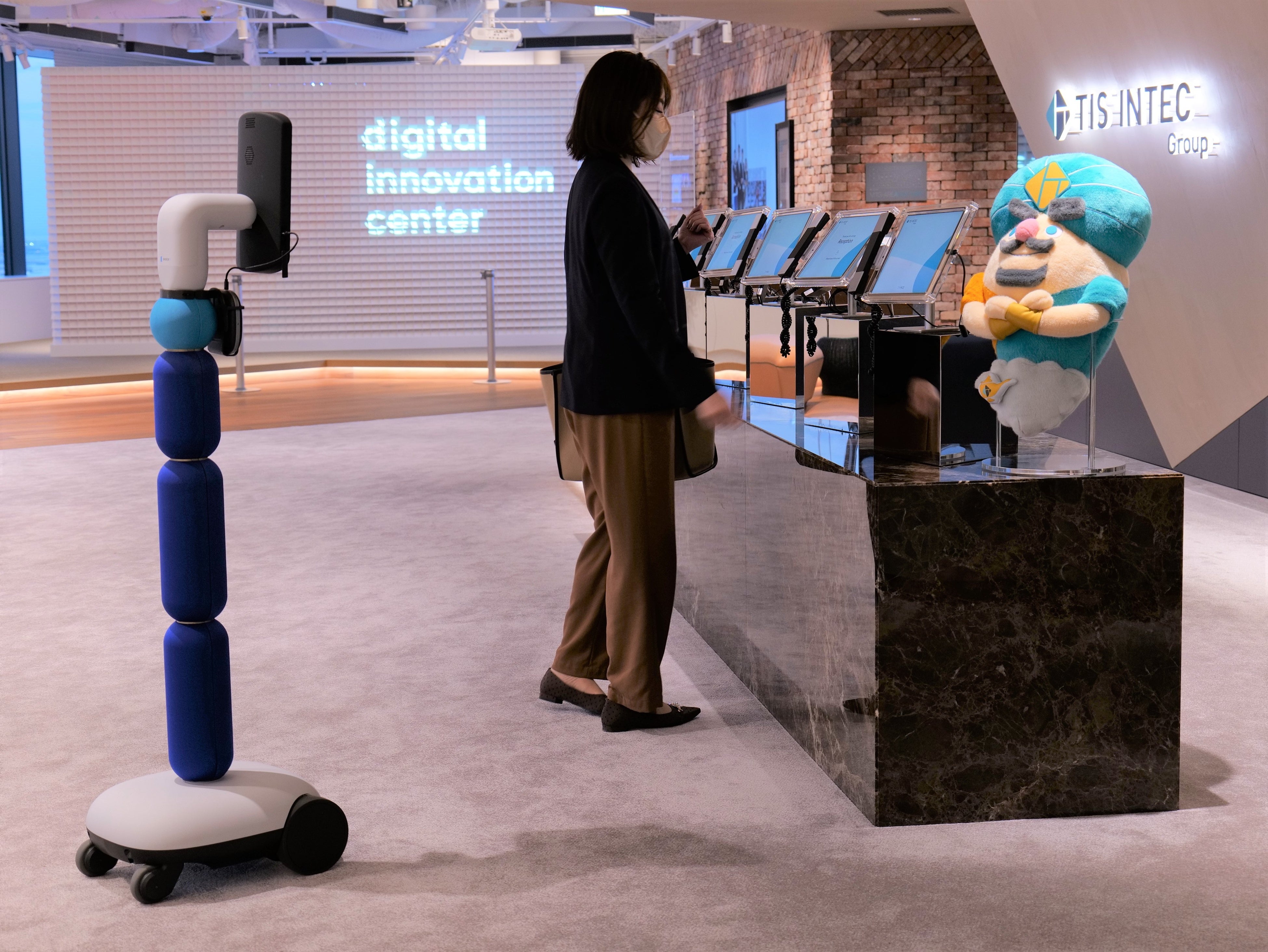 毎日朝10時から17時まで、お客さまをnewmeでお出迎えして、受付のタブレットがある場所までご案内。