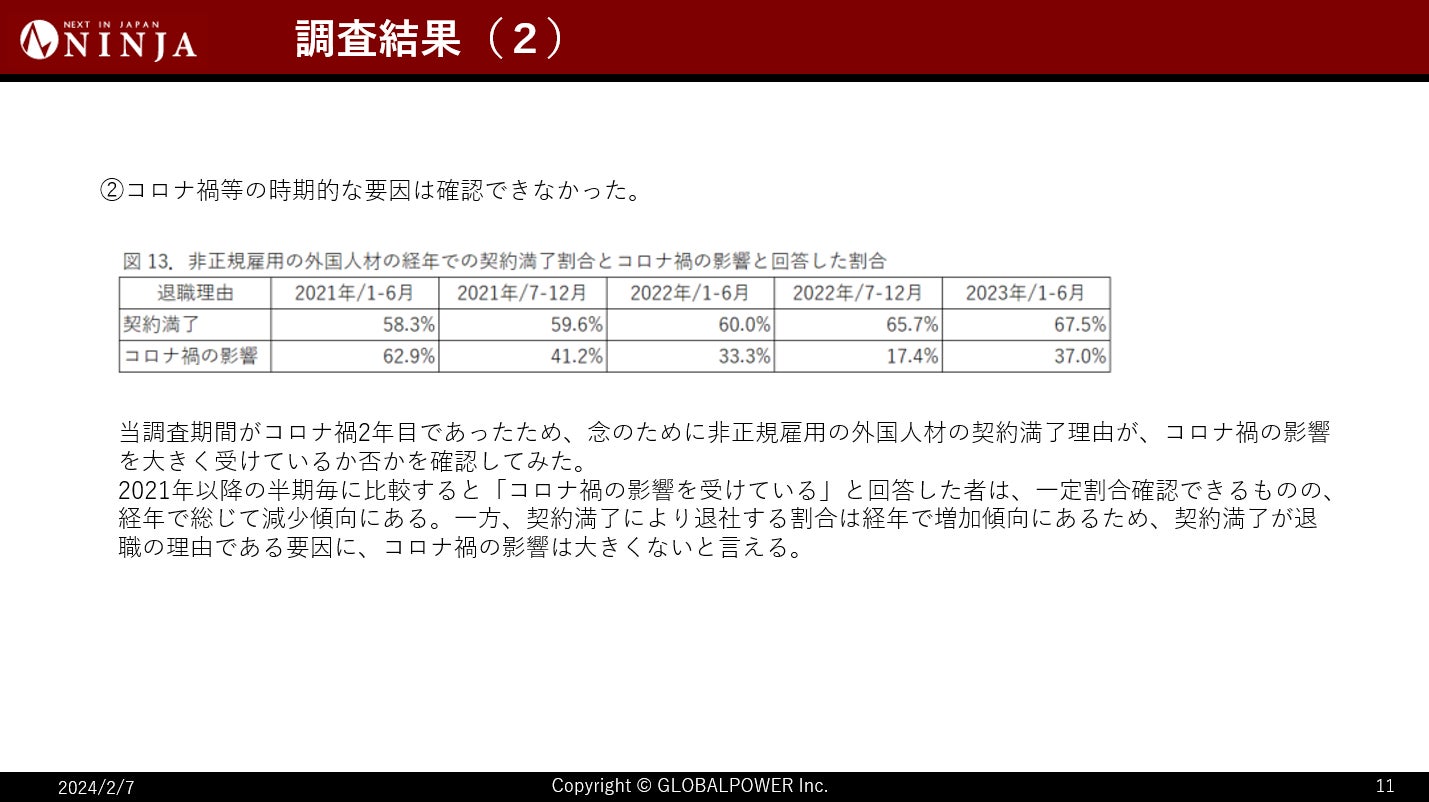 非正規雇用において、日本人材と比較して外国人材が契約満了時に退職する割合が約4倍に達することがわかった。コロナ禍などの一過性の要因ではなく、その傾向は年々増加している。これは、そもそも外国人材の有期雇用の期間が短いのか、企業側の意向なのか、外国人材側の意向なのかは、現時点では不明である。