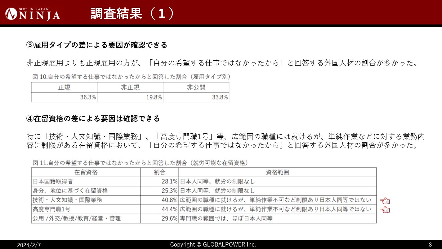 ・退職理由1位「自分の希望する仕事ではなかった」については、雇用タイプ・在留資格による要因